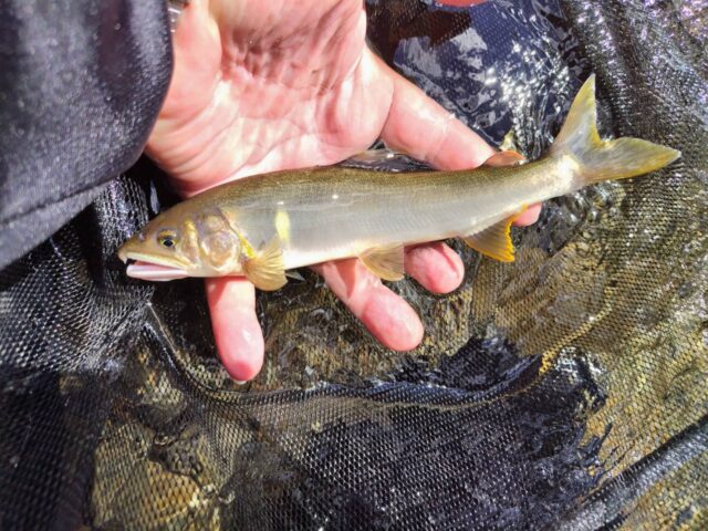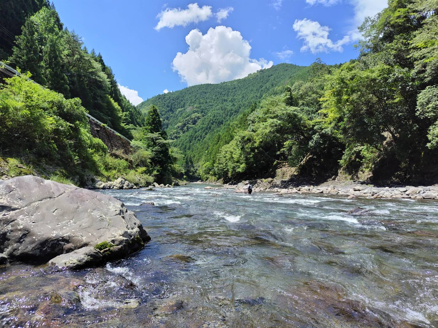 西名販道郡山から高野山を経由し、約6時間の道のりを経て龍神着は午前8時です。松阪食堂さんで久しぶりのあいさつ後、日釣券とオトリを購入し、支流の小又川合流付近へ入川。川を見てまず思ったのは、山あいの清流で日当たりが遅く、9時入川時では辺り一面まだ日影・・・水温が低いのには鮎は慣れているだろうとはいえ、活性が低いかなぁ?という予想です。が、(*^^)v瀬肩の大石の前へ最初のオトリ鮎をスッと入れると、開始10秒で1尾目を取り込みます。次の石、次の石、と、10分足らずで3尾を取り込みますが、一週間ほど夕立と増水が続き、幾分鮎が痩せ気味に見えます。コンスタントには続かず、午前中9尾で昼休憩としました。