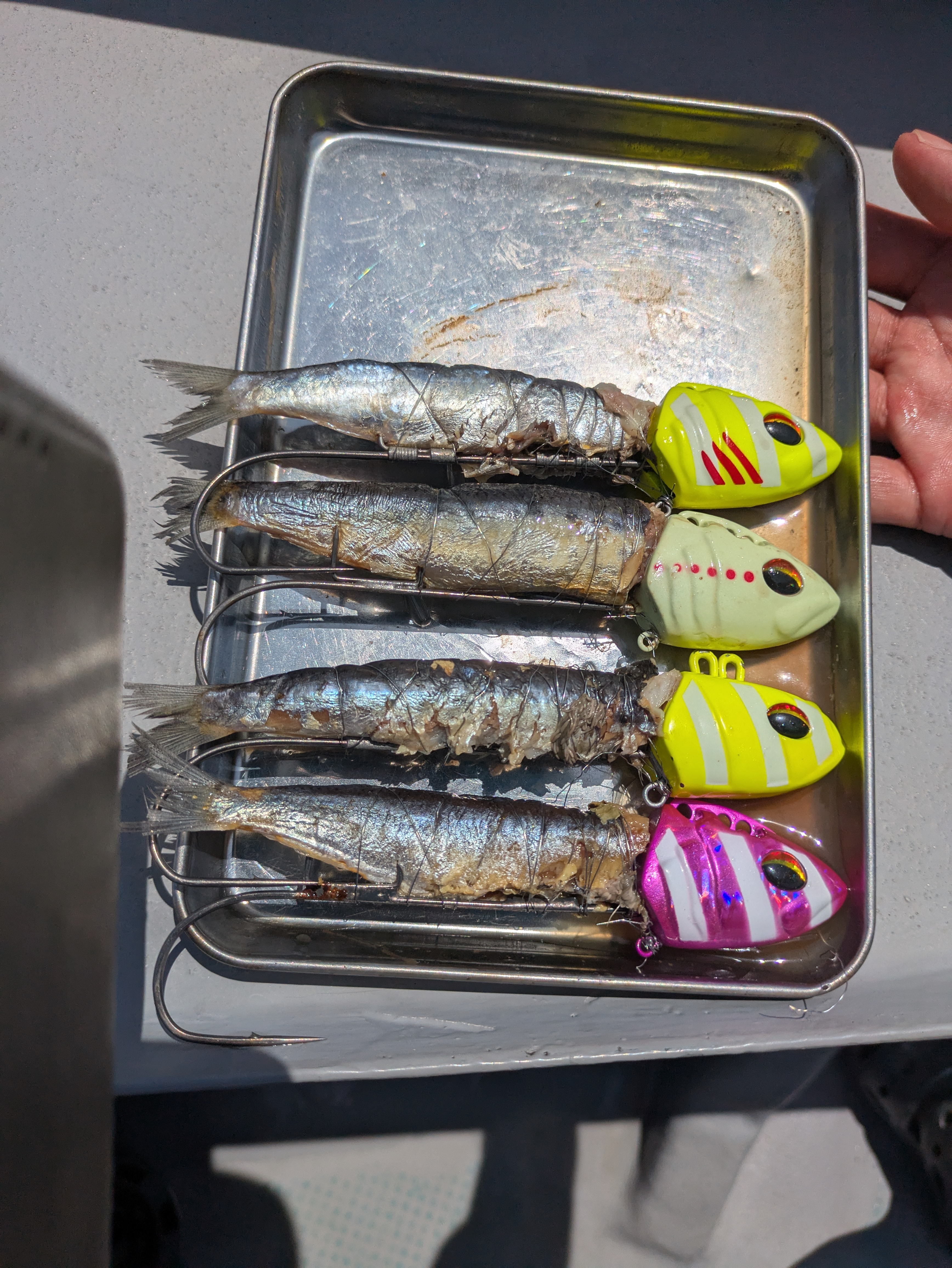 ポイントにはやはり人気釣種だけあり愛知だけでなく、三重からも船が来ています。ただ、アタリが少ない。アタリが出ても、ん?…サバフグ…苦戦。釣れても指4程と厳しい。次第にアタリも遠のき湾内タチウオポイントへ。デカいのは釣れないと勝手に判断して小型狙いに。ポツポツ釣れている。テンヤのカラーか?と思い、アタリの出ていたパープル系に変えたらアタリが出だして、ヒット!指2でした😅棚は深めで追わない。2メートル程をいったりきたりで数を稼ぎました。そうこうしていると、後ろで指8、126センチがあがりました!まさにドラゴン🐉共喰いの個体がいるようで、小型タチウオを狙っているとの事。夢がありますね✨