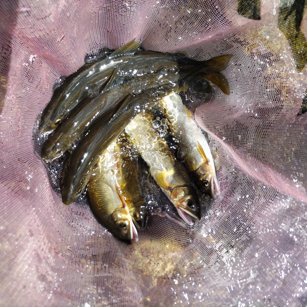 静かにポイントに立ち込みルアーを入れます。石の前でルアーをクロスさせるようなイメージの動きをさせて石の横から前にルアーを持っていくように誘うとギュイーンと掛かってくれます。そして群れ鮎に対してはルアーが動くパッと散るのでノーアクションでルアーをその場に止めるようにします。もちろんこの時はハリスは長めに設定し群れ鮎がルアーの近くを通るとガガガッと掛かってくれます。この繰り返しで何とか鮎を釣るのとができました。