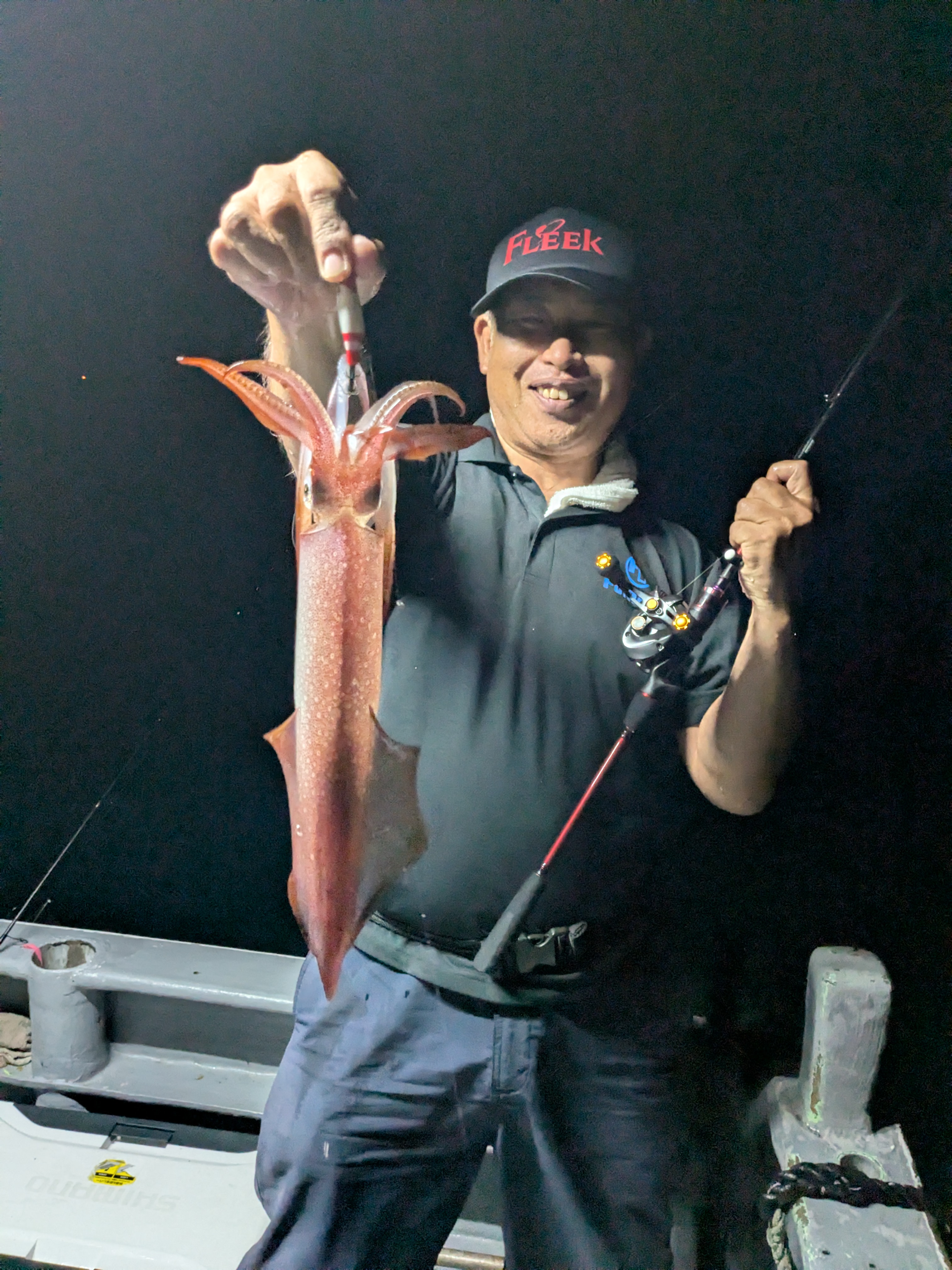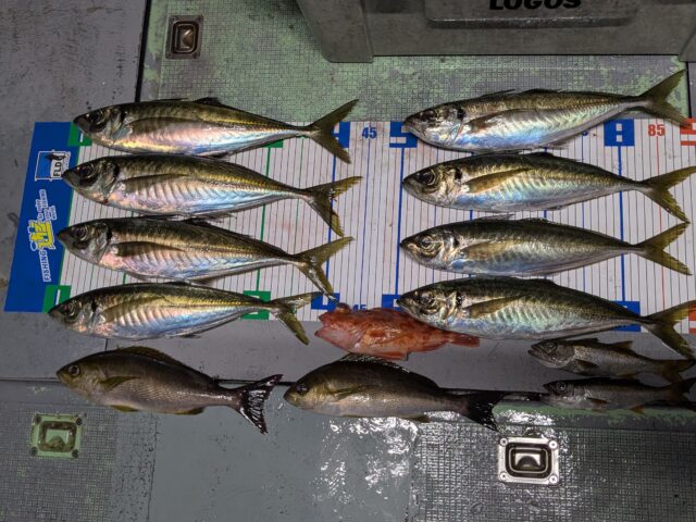 ギガアジが釣れているという事でバチコン&イカメタルで波切の「春夏丸」さんにお世話になり楽しんできました。夕方6時に出船し港から近くのポイントへ水深40m程のポイントへアンカーを下し船長の合図で実釣スタート。開始早々カサゴがヒット。少しボトムを狙いすぎたのか周りはまだ明るいが少しタナを上げて狙ってみるとゴンゴンゴンッガツーンと激しいアタリ!ドラグを出しながらのファイトを楽しみ上がってきたのは40cmクラスのギガアジ。これは嬉しい。この時ヒットしたワームは海毛虫2.5in’の「ピンク」でしたが、このあと「釜揚げオレンジ」、「赤バチ」カラーローテーションしたところどのカラーでも釣れました。その後も暫くアタリが続きましたのでケイテックのイージーシェイカー2.5’「シャンパンピンク」にチェンジしたところこの日最大の45cmがヒットしました。21:00を過ぎたあたりから潮が変わりぱったりアジのアタリが止まってしい悩んでいた所にイカが泳いできたのでひょっとしてと思いイカメタル投入。10m程のタナで即ノリ!。連続で釣れるかと思えばちょっと間をおいてズンッと重くなるアタリ。良く引くのでおかしいなと思いながら上げてくると胴長30cmを超えるこの地域では珍しい大型のアカイカ。その後もポツリポツリと拾い釣りで9ハイゲットしたところで沖上りでした。アジ、イサキ、アカイカと豊富な魚種をキャッチでき大満足な釣行となりました。