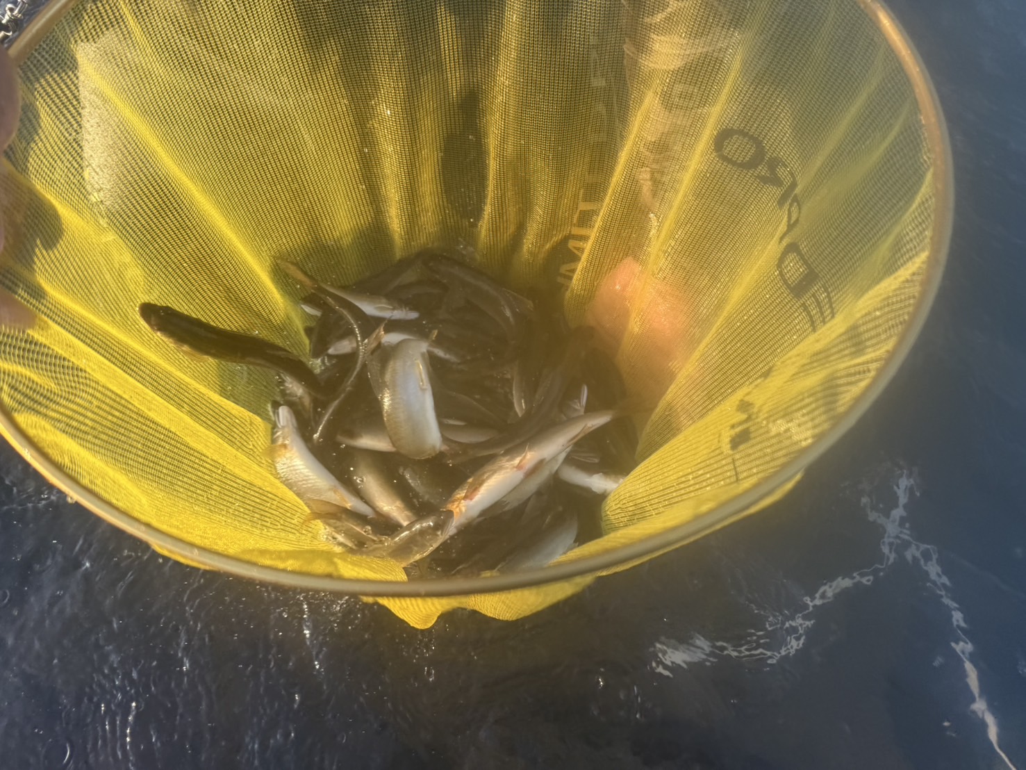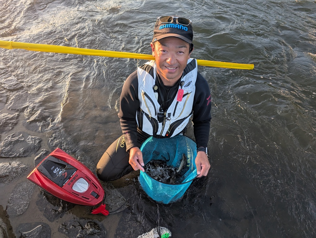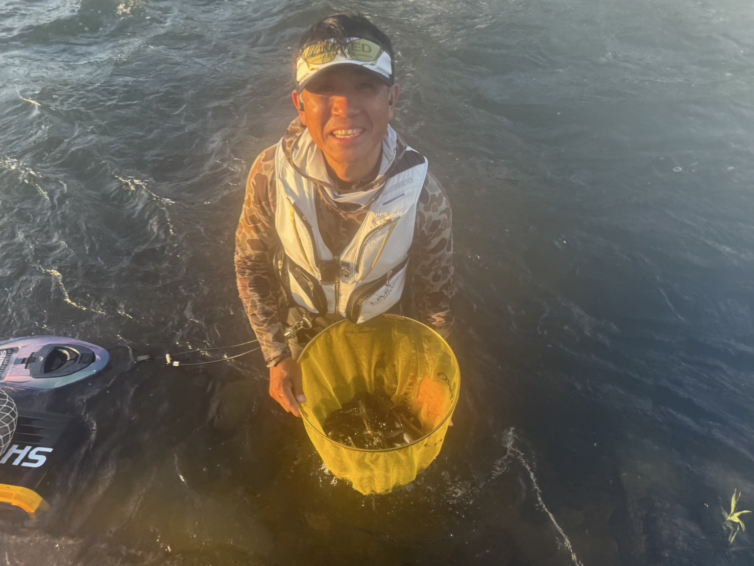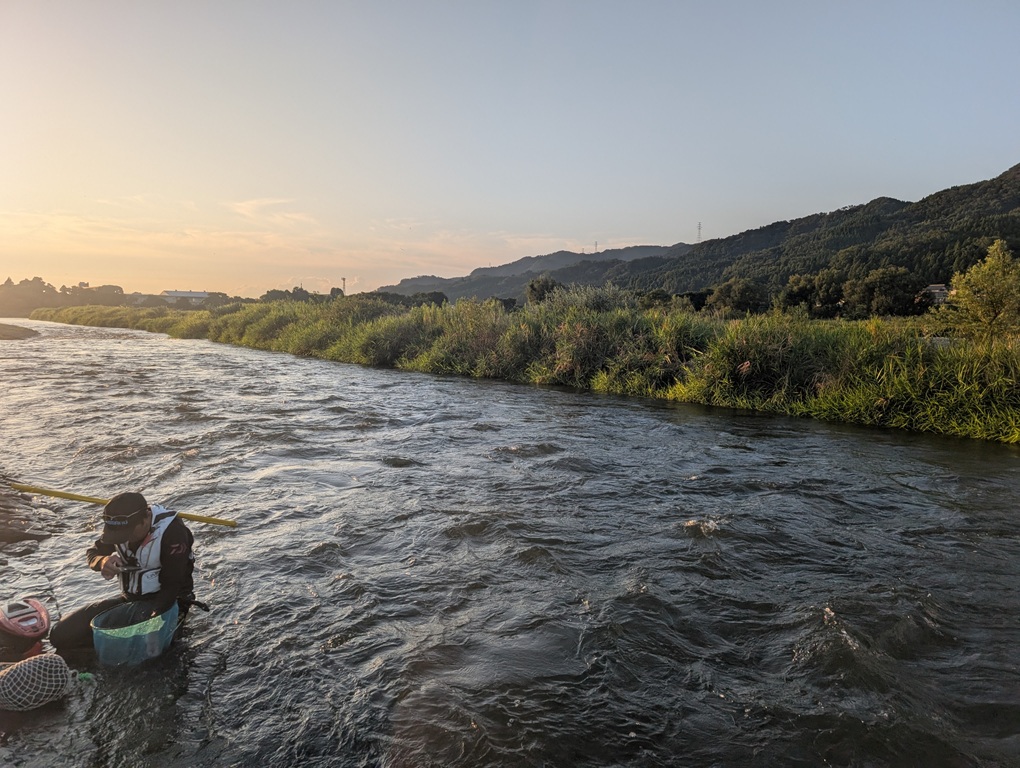こんにちは~焼津街道店の三浦です。前回もたくさん釣れた九頭竜川中部に8月27日に行ってきました。当日は朝7時にオトリ屋さんに集合し約10年ぶりの谷口へ。人気ポイントなのに到着すると人がいない。準備をして8時前から釣り開始。同行者と右岸、左岸に分かれて釣り下っていくと左岸の同行者は入れ掛かりでサイズもよさそう。右岸は平均サイズが小さく連発も少ない、途中で短時間でしたが雨が強く降る時間もあり、1時間30分くらい中断がありましたが、18時頃まで楽しみ64匹の釣果、鮎のサイズは12㎝~22㎝まで平均サイズは17㎝くらいでした。雨の影響か本当に人が少なく、テトラより下は貸し切りで1日楽しめました。
