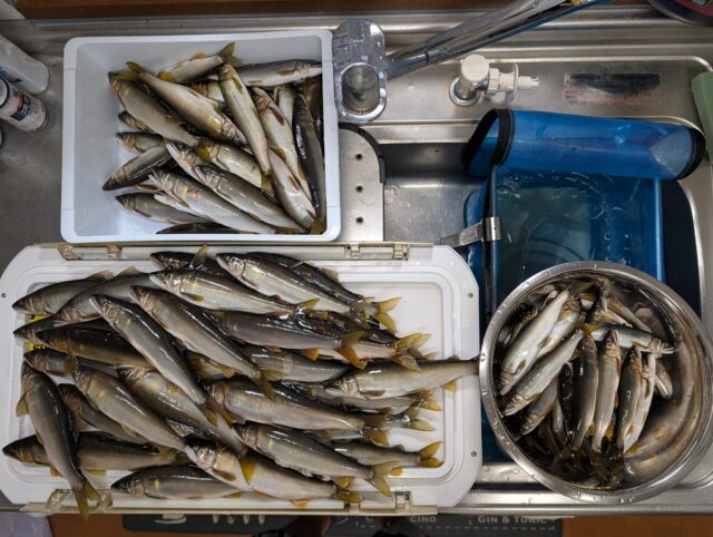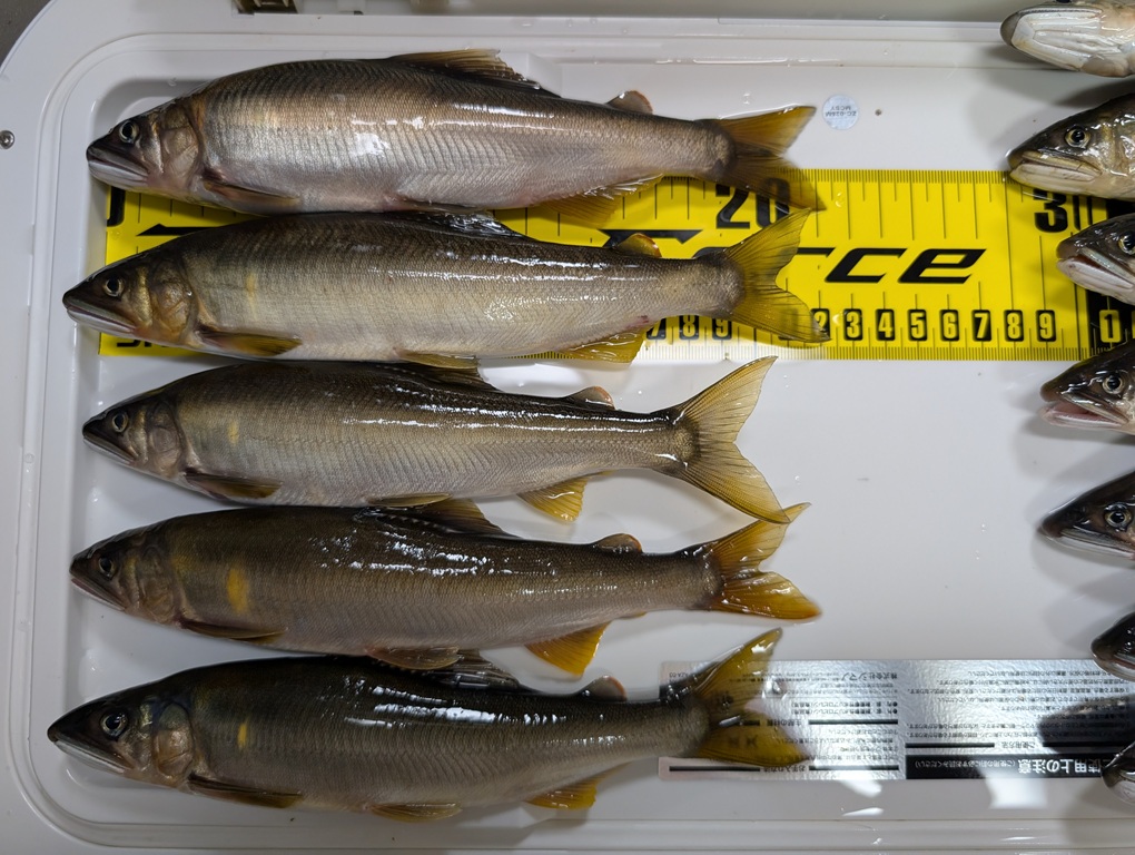 こんにちは~焼津街道店の三浦です。28日も九頭竜川中部での鮎釣り。朝6時30分にホテルを出発し、7時過ぎにはオトリ屋さんに到着、オトリを回収し、前日同様に谷口に入川。ポイントに到着するとやはり人気ポイントだけあって人が多い。朝は自由に動けましたが9時過ぎからは一気に人も増えてきました。前日の雨の影響で魚が動いたのか、昨日よりもよいサイズが揃います。午前中の釣果は46匹。午後からも同じようなポイントを釣り、18時まで楽しみ49匹追加し95匹の釣果でした。良型が多く九頭竜川中部での最高釣果も更新でき、非常に楽しい一日でした。