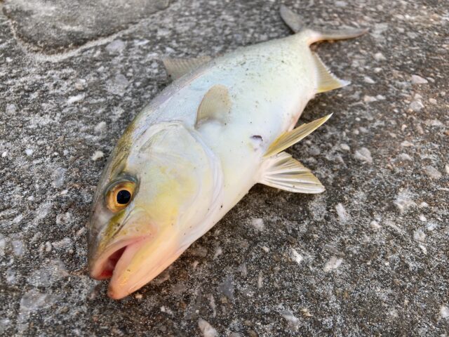 キャストすると気持ちよくルアーが飛んでいきます。今回使ったリールは17ツインパワーXDでしたが、24ツインパワーならもっと飛距離が伸びそうです。糸の巻き替えが面倒だったので持ってきませんでしたが、次回は使ってみたいと思います。開始してしばらくシャクっているとゴンというあたりでかわいいツバスをキャッチ。青物の顔が見れて一安心ですが後が続かず。