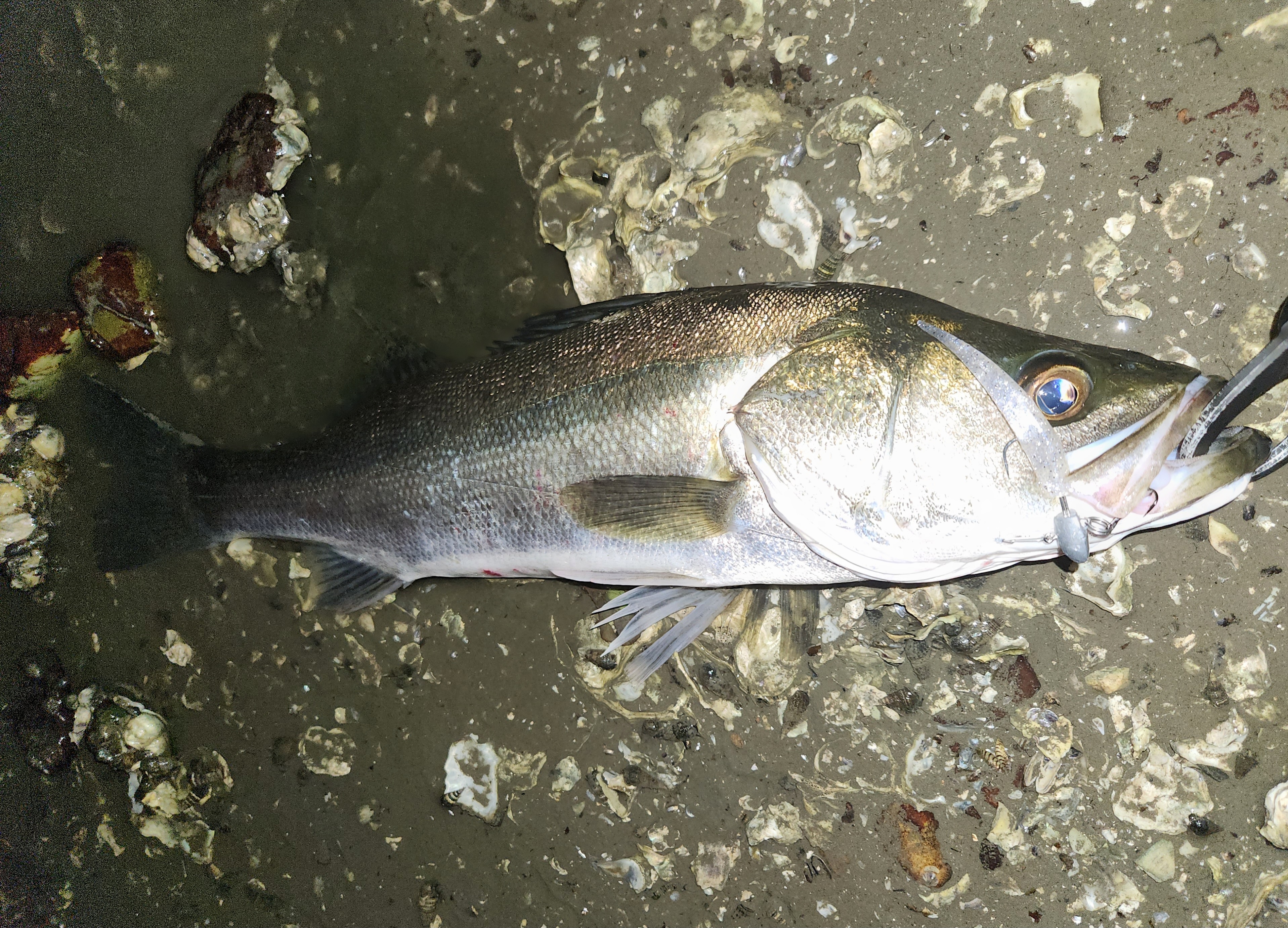 それでも投げ続けているといいアタリが!合わせてヒット!そして激しいエラ洗い!全然セイゴじゃない!元気のいい引きをいなして寄せてきてネットイン成功!50cmクラスのいいシーバスでした。ジグヘッドのアシストトリプルフックがいい仕事をしてくれました。