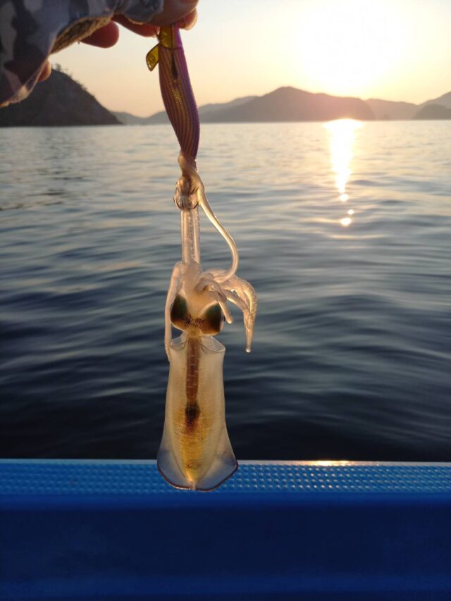 水深7メートルから4メートル辺りを探ってようやく一杯。友人もティップランで追加。友人はキャストで追加。