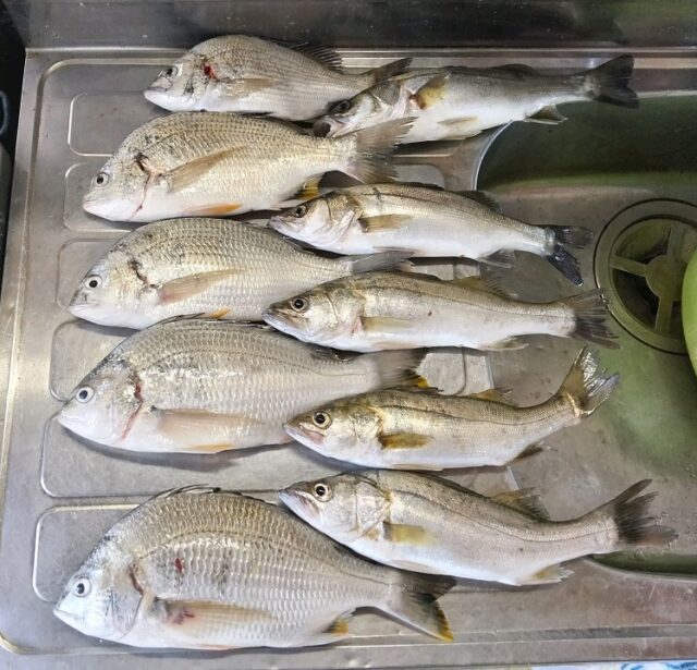 二晩目の入りはボイル狙いに向かいますが先行者ありで入れず 離れた場所のチェックをしていると場所が空いたので入ってみるが反応が出ないので後から来た方に場所を譲り違うポイントへ 、しばし投げるとアタリ!元気に走り回って見えたのはキビレでした。ココから連発でキビレが掛かり4匹釣って2バラシラストにクロダイが釣れてアタリが止まり場所移動、次の場所は魚っ気が無いのですがルアーを投げると触るのでフォローでエサを投げると食いました!セイゴ確保、シンペンを投げていると今度はシンペンにヒット!2匹目確保、シンペンで触るが食って来ないのでエサを入れると食いました!3匹目確保、シンペンを巻くと水面で派手に出るが乗らず しばし投げるとガツン!と突然ヒット!4匹目確保で次を派手なジャンプでバラシで最後は小型メタルジグを丸飲みされて5匹目を確保して今回の釣行は終了です。