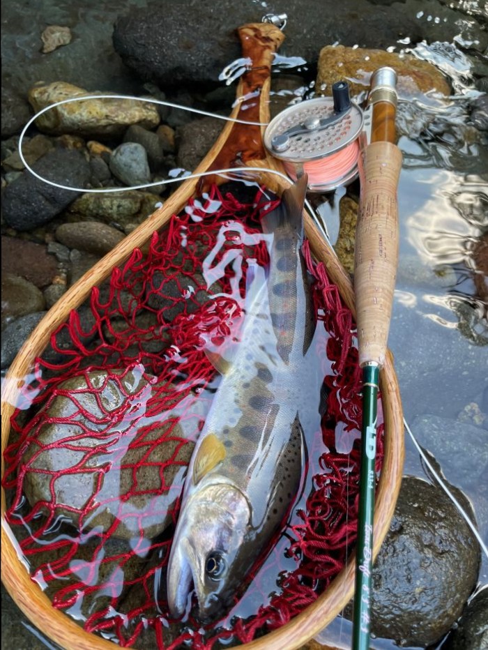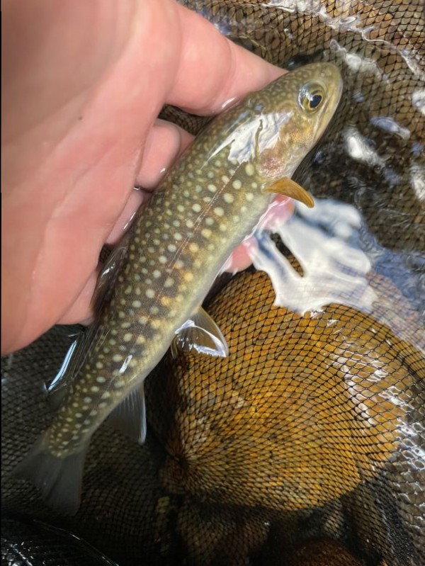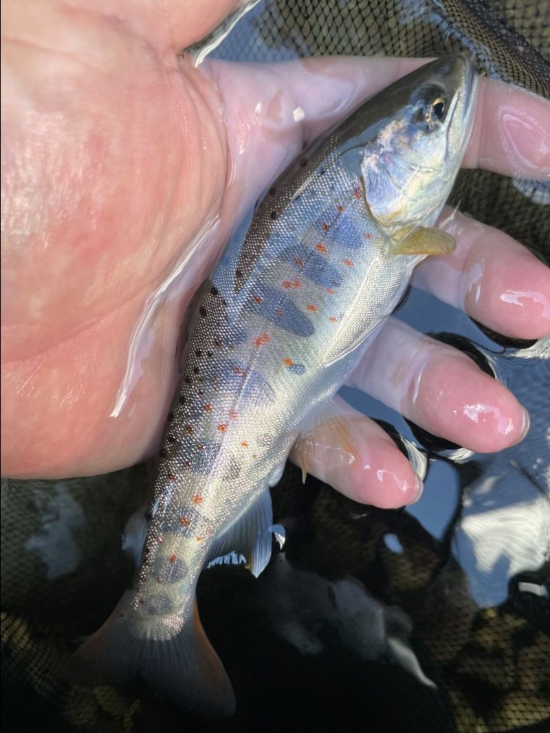 一方、最後までドライフライで粘った友人は、最後の夕暮れ前ギリギリで25cmのヒレピンアマゴを釣っていました。