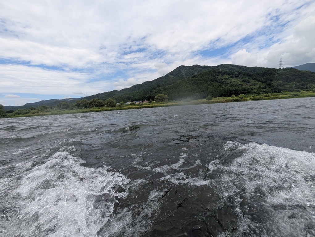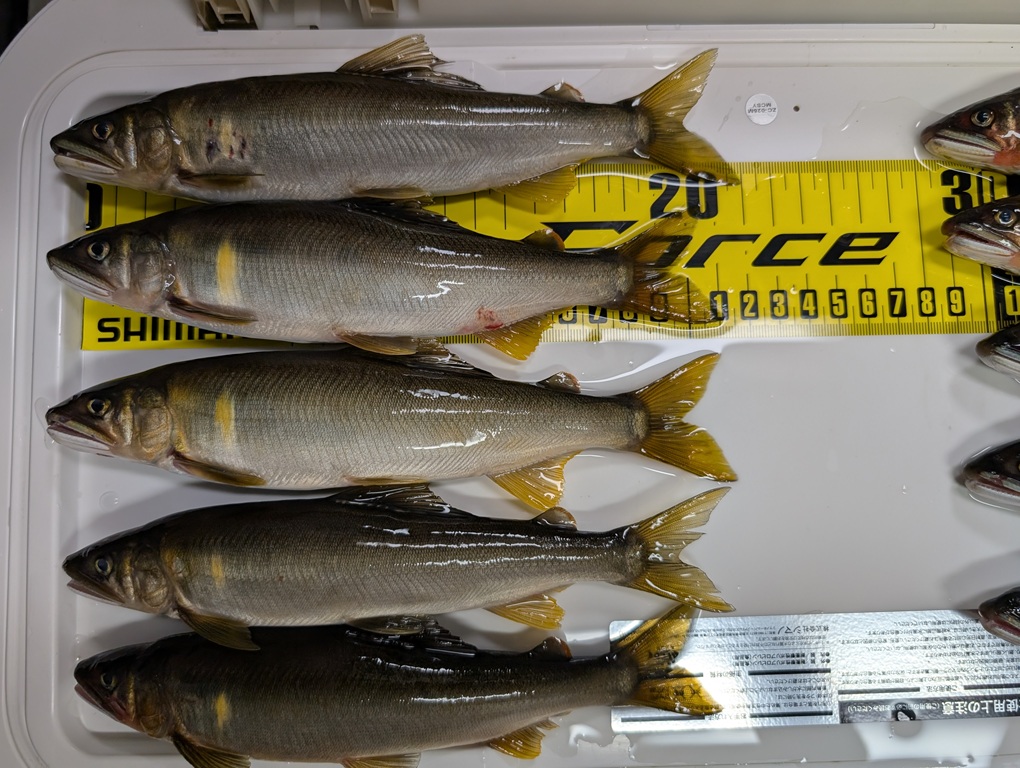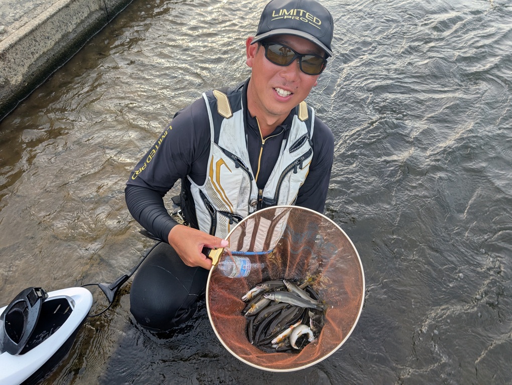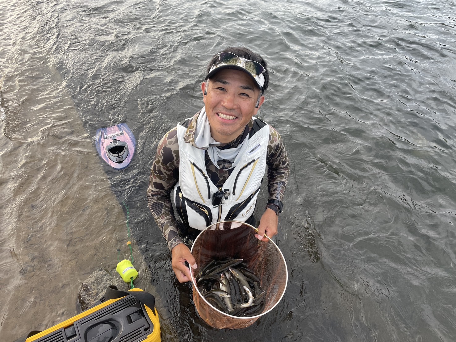 こんにちは~焼津街道店の三浦です。9月3日に福井県の九頭竜川中部へ鮎釣りに行ってきました。当日は宿を7時30分ころ出発し、8時過ぎには谷口のオトリ屋さんに到着。準備して8時30分ころから釣り開始。私は左岸の流れ、同行者は右岸を釣り下ります。谷口は友釣り専用区ではない為、コロガシをされている方も数人見えました。開始5分程で1匹目。その後もポツポツ釣れ続け、午前中は39匹、午後からは少し上流から探るも反応が悪かったので、一気に釣り下り、17時まで楽しみ34匹追加し73匹の釣果でした。サイズは12㎝~22㎝まで平均サイズは18㎝くらいでした。九頭竜川の鮎もまだまだ若く台風の影響が気になりますが、9月いっぱいは楽しめそうですよ。