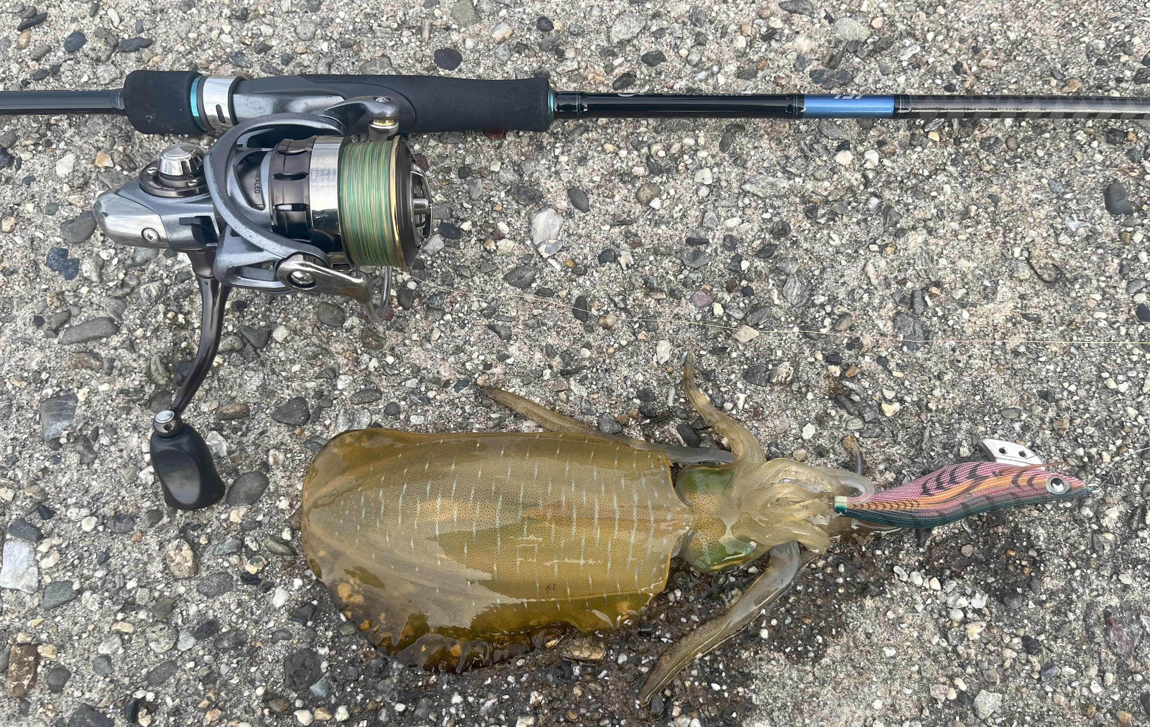 朝の6時からスタートして1時間後の7時にヒット!エギはヤマシタのエギ王K3.0号カラーは軍艦グリーンでした!