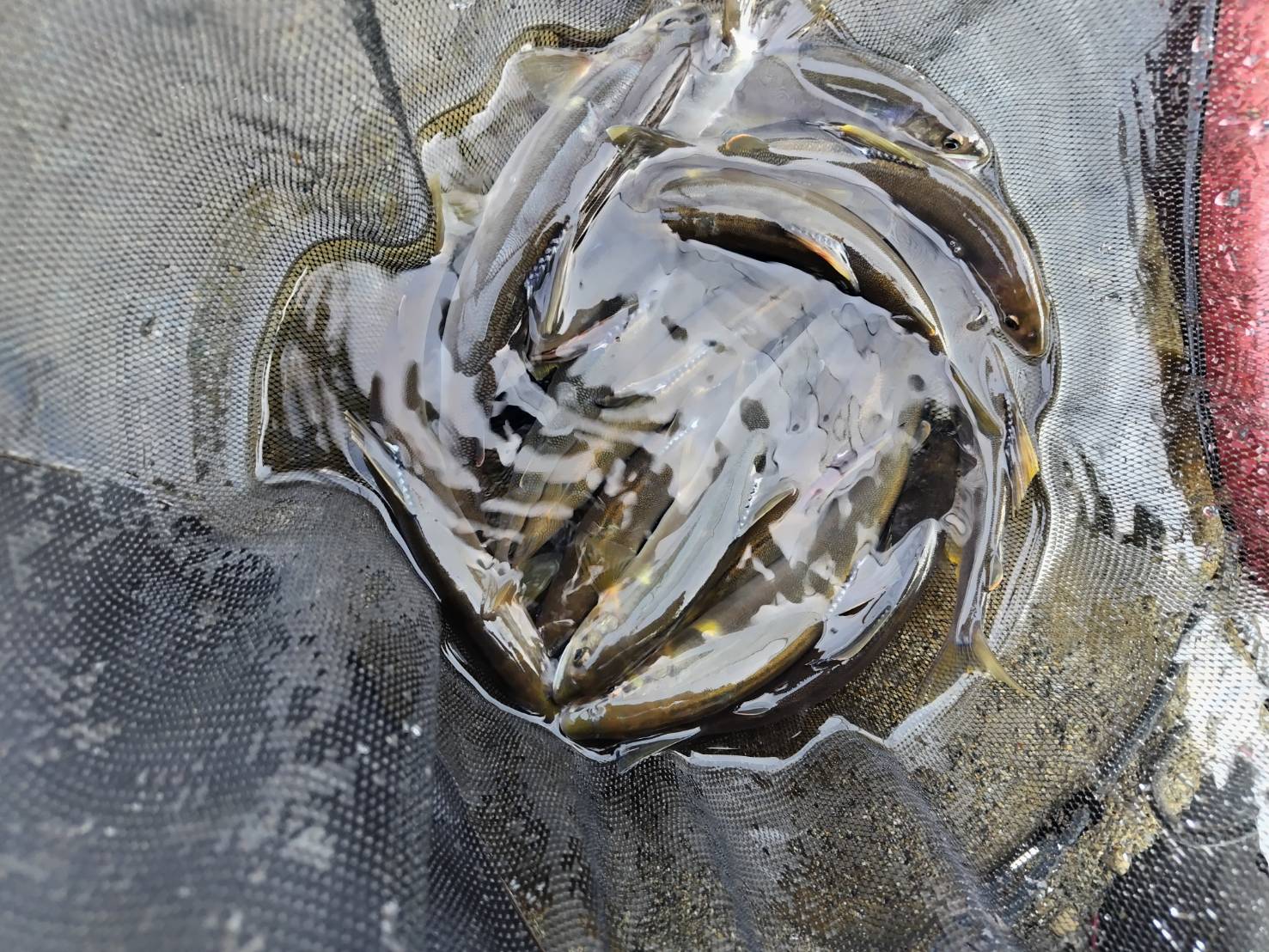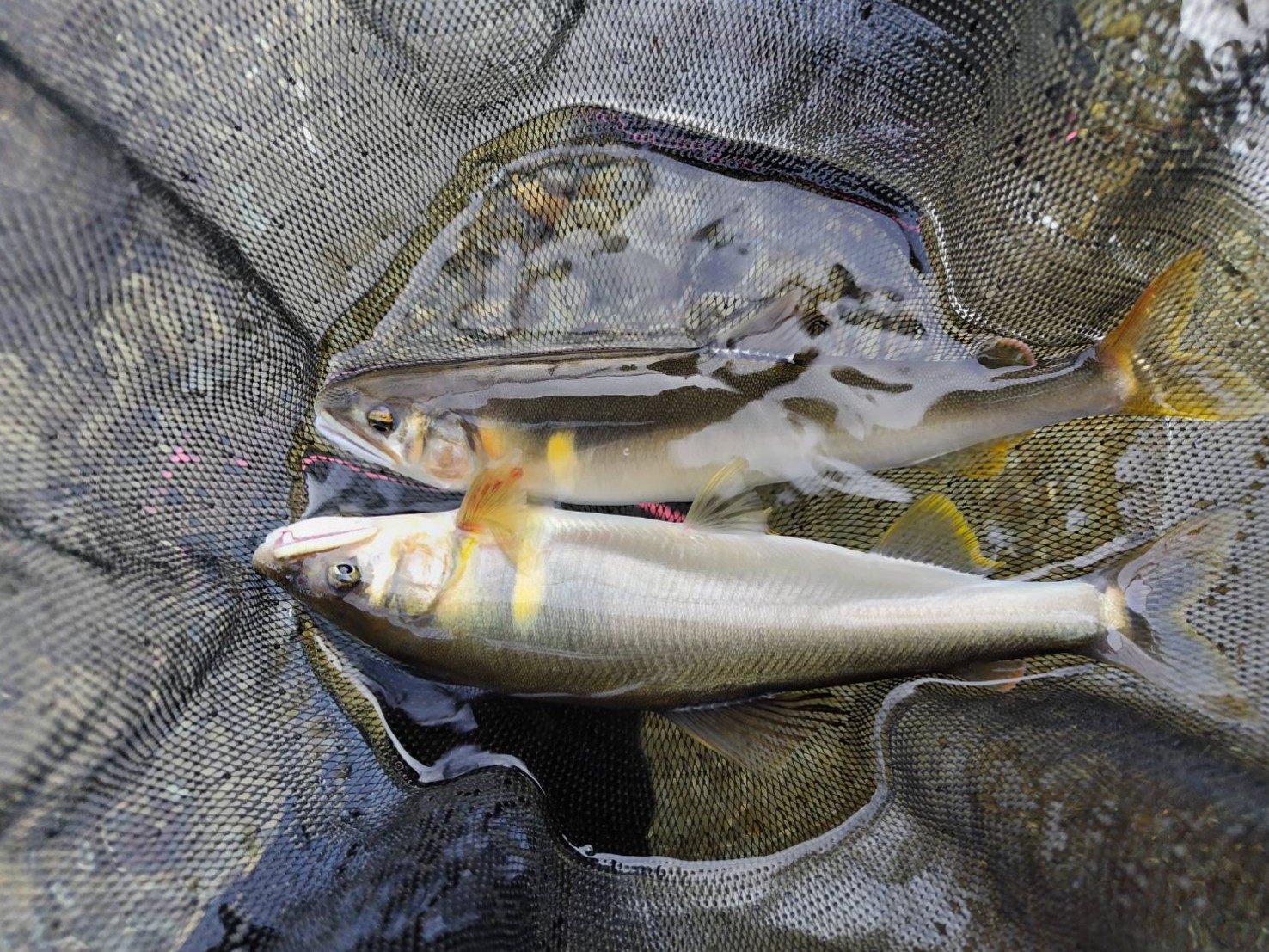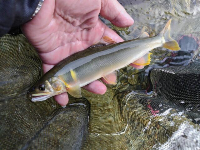 民宿あまのさんへ到着するも話がはずみ、オトリ鮎と日釣り券を購入し、目標ポイントの中呂地区下流到着は11時を過ぎておりました(#^.^#)。。。早めの昼食を済ませ、長い一本瀬へオトリ鮎を送り出しますが、水中からの反応が無いまま1時間・・・「ん~(*_*;」さらに1時間で2尾目のオトリ鮎も弱り始め、「これはいかん」と、瀬脇の棚へ入れなおした瞬間に、ようやく18cmほどの1尾目を取り込みます。「そーゆーこと!?」・・・このポイントは今シーズンの萩原地区では人気ポイントで、「いかにも!」というポイントは毎日竿が入っているのかもしれません。そこで、川の真ん中の中州側に立ち、両脇、細い分流の瀬肩などを狙い、17時過ぎまで17~24cmを18尾取り込んで納竿としました。