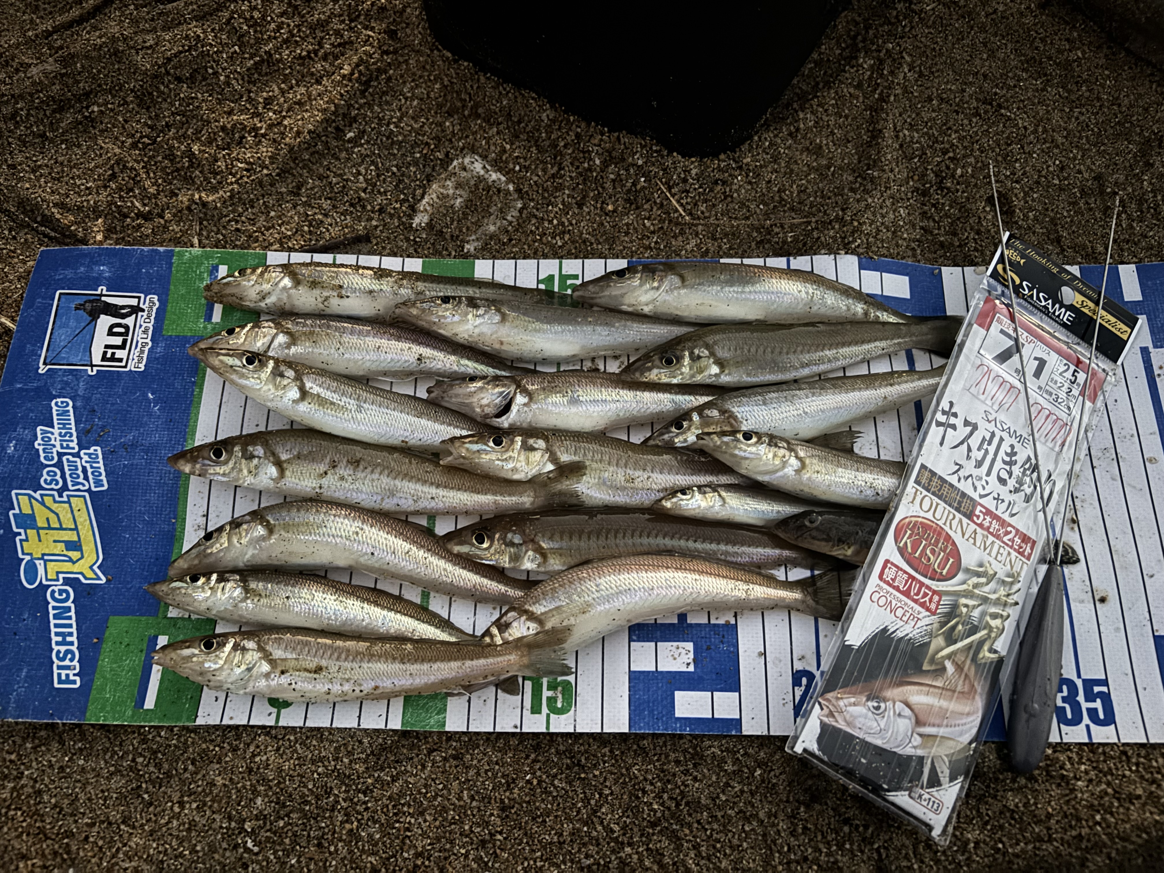 ピンギスがメインとなりましたが、それでもポロポロといいサイズのキスも釣れてくれました。終盤はピンギスを避けるため餌をゴールデンイソメにし、垂らしを長く付け狙うことに。すると、ピンギスを避けることができ、持ち帰りサイズもポロポロとひろうことができました。