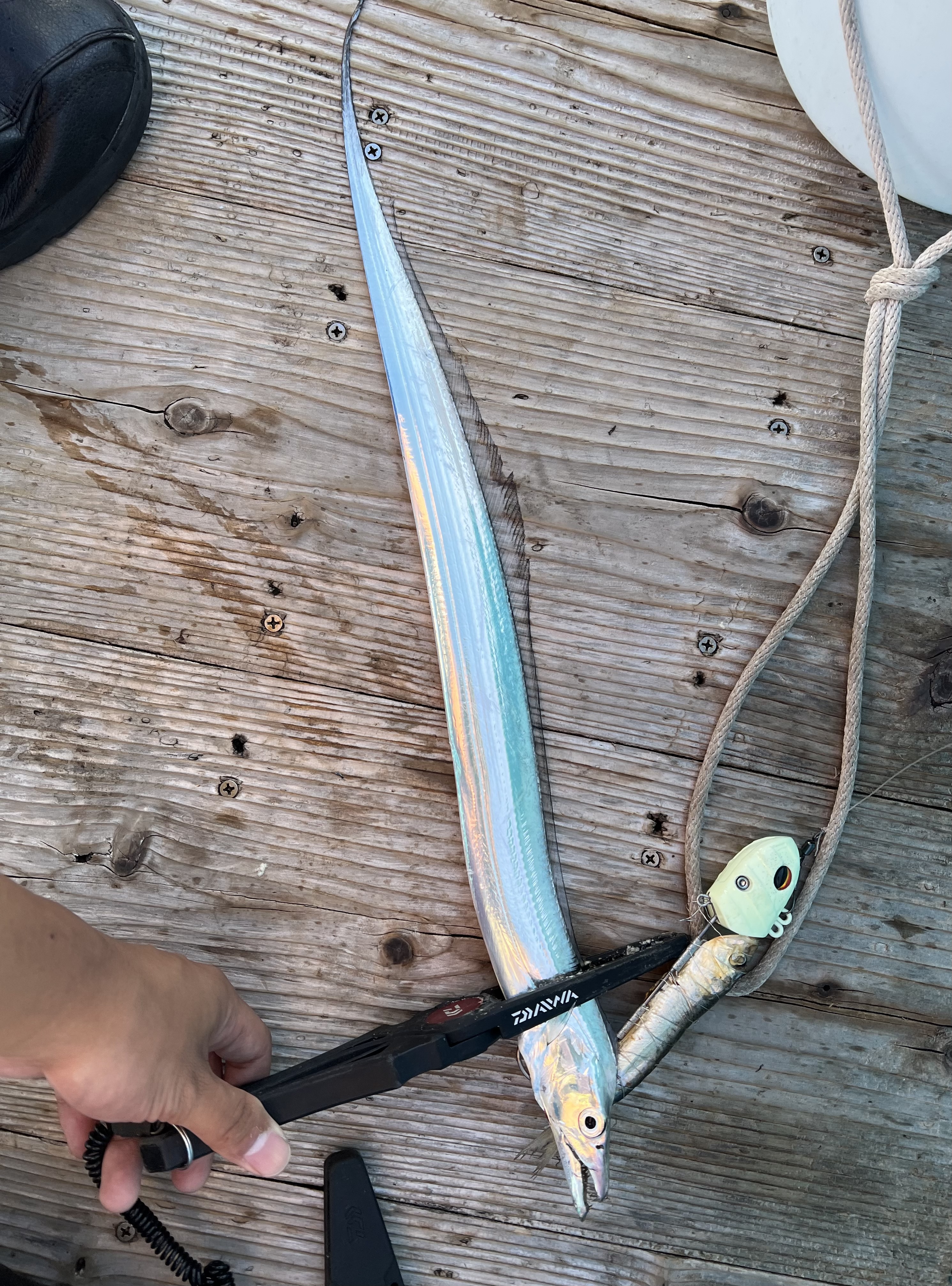 この日は元栄丸様に乗ってタチウオテンヤに行って来ました。前日は台風ということもあり伊良湖までは行かず近くのポイントで釣り開始。基本的には落としてデッドスローで巻いていきます。使用したテンヤはダイワ様の船タチウオテンヤSS STを使用し塩締めイワシを装着しました。事前に塩締めしておくとエサ餅が良くなります。太刀魚の大きさは小さく活性も渋かったですが前アタリがあっても合わせず本アタリを待ってから合わせると釣ることが出来ましたよ。そのあとのリレー便では同乗者がショゴや真鯛、ヒラメを釣っていましたよ。ロッドの貸し出しありますので初心者も安心!是非狙ってみて下さい!