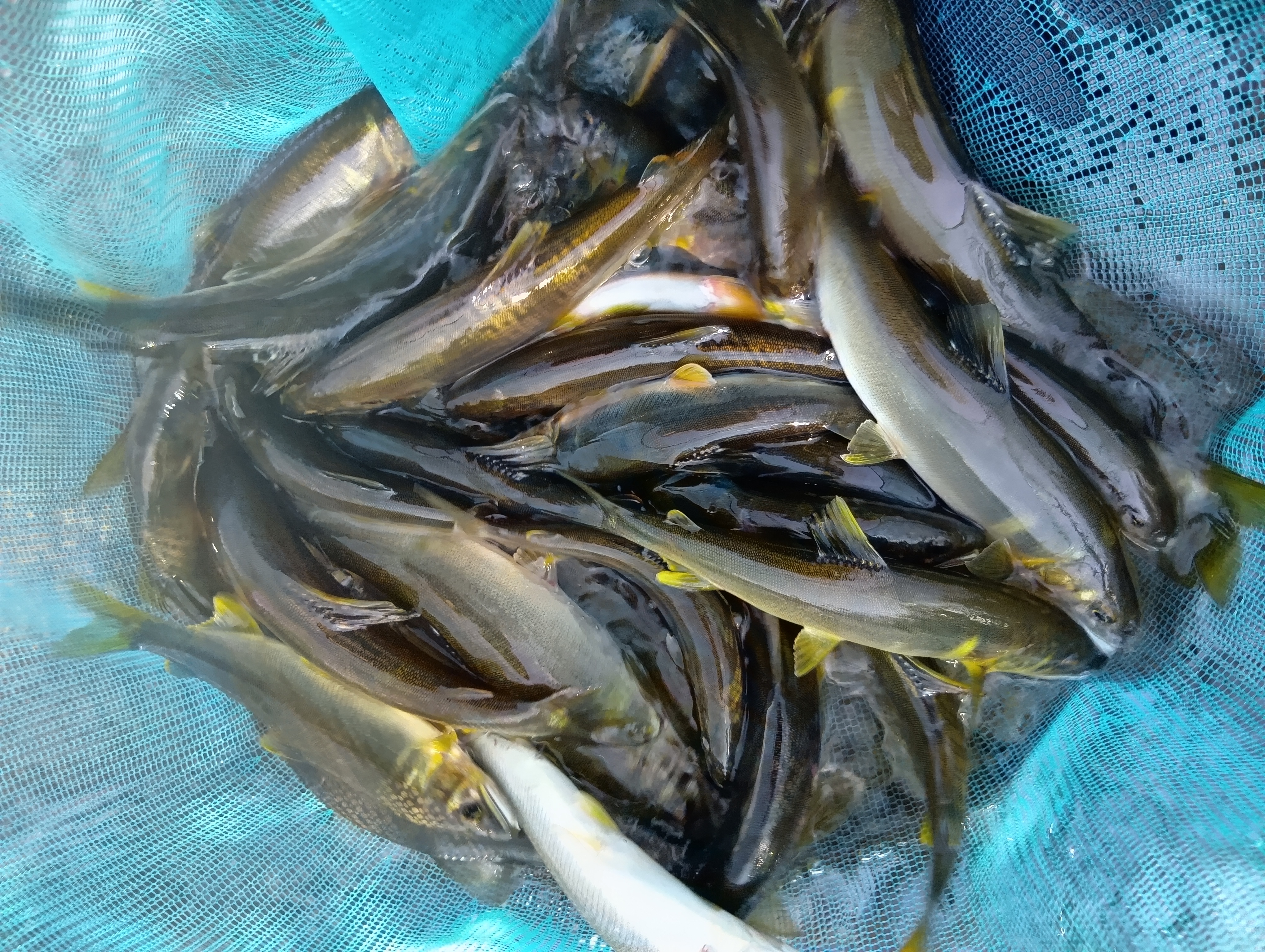 社内メンバーと大又川に行ってきました。ちょっと早いですが5時半に現地到着。渇水が続いていましたが、台風で一気に増水からの引き水ですので期待大!でしたが、オトリ屋さん曰くちょっと厳しい様子。スタートは桃崎大橋から開始。橋から100mほど下ったところからスタート。普段は渇水状態が多い川なのでいい感じの水量です。開始早々釣れてくれましたが、その後はぽつぽつ追加。日が出てから少しましか!?と思う掛かり方もありましたが、小型中心にぽつぽつです。黒い錆かかっている個体ばかりで瀬でもトロ場でも掛かりますが、入れ掛かりは無く…午後からは橋の上流へ歩いてチャラ瀬で小さいですが真っ黄色が連発!数匹釣ったところで本命の急瀬へ。先行者の方が結構釣っていたので3匹のみ。15時に納竿しました。最終オトリ抜き31匹でした。