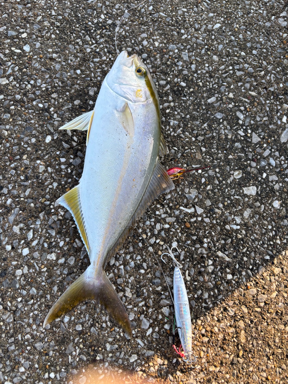 好調の遠州サーフに小型青物狙いで行ってきました♪到着するとたくさんの先行者の方がいて思っていたポイントとは少し外れたポイントに入りました。まずはブレードジグにジグサビキでやってみます。開始して数投のうちに手前でヒット!お!?と思っているうちに痛恨のバラシ。。。気をとりなおして投げ続けますがバイトがなく時間だけが過ぎていっていると奥の方で竿が大きく曲がっています。いいサイズのシオが上がっていました。自分もと思っていましたがそれでも掛からない。。。気を取り直して投げていると隣の方がツバスをヒットさせていました(たまたまお会いした刈谷港店のお客様でした)。その後は時間だけが過ぎていき、奥でやられていた方が止められたタイミングで場所を譲っていただき、ジグもスロー系のジグでヒットさせていた方を見たので自分の中では完全にお馴染み♪シーフロアコントロールさんのタイニースパンキーの40gをフルキャスト!ボトムを取って1ジャークいれると一閃!いいバイトが出てくれました♪手前で根に突っ込みだしたので少し焦りながら無事ランディング完了!満足のいくショゴが姿を見せてくれました♪その後同じパターンでソゲらしいソゲとサバを釣ってタイムアップ。周りではどんどん釣れていました!行くなら今がチャンスです♪