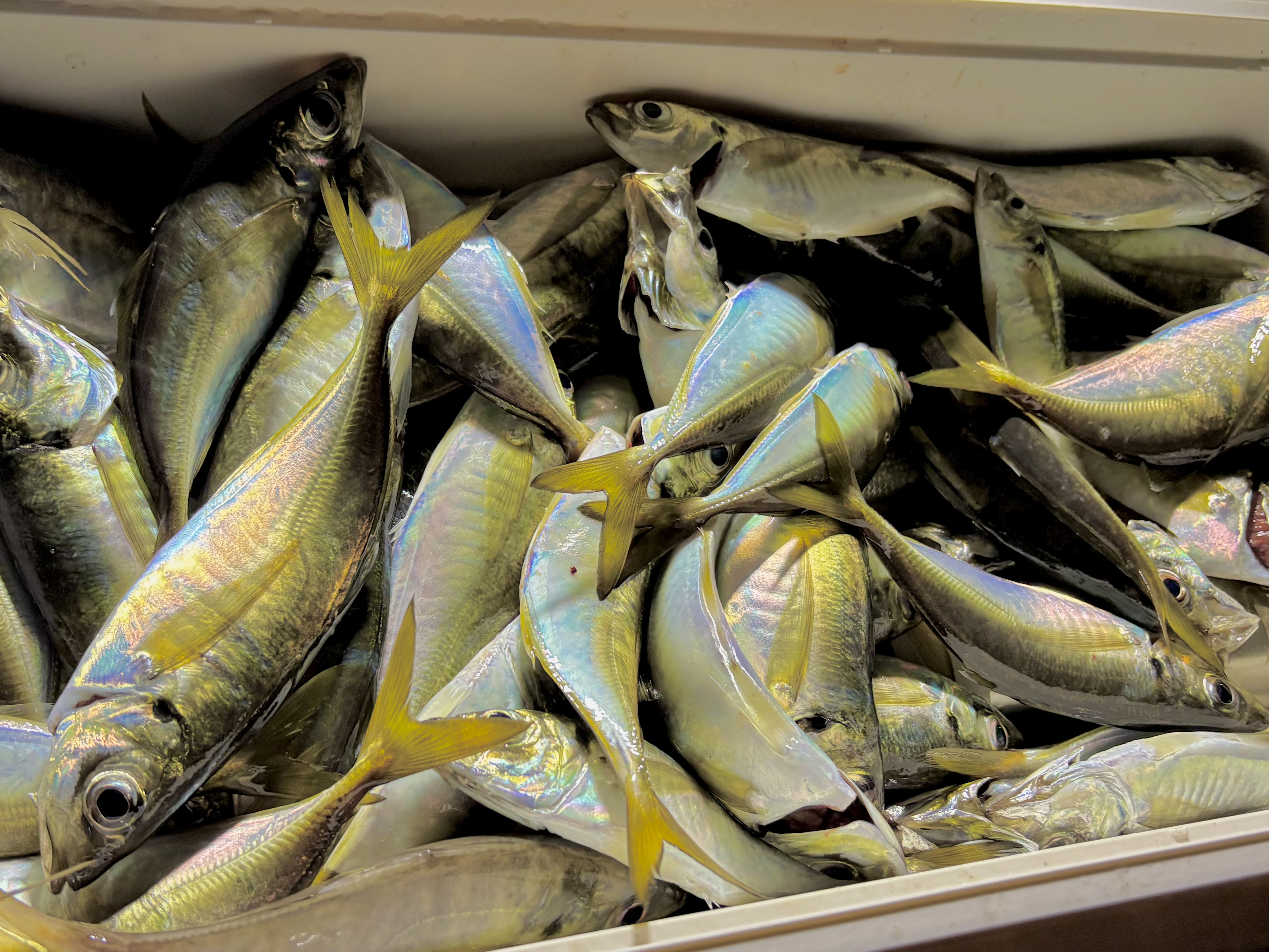船長から2gが良いと伺ったので、クリアブルーのぺちゃんこヘッド2gにセクシービー2inをセット!ポイントに到着するとすぐに猛チェイス!ふたたび投げて少し止めたり巻いたりしているとグッと重みが乗るアタリ!20センチほどのすごく丸々とした良いアジがヒット!