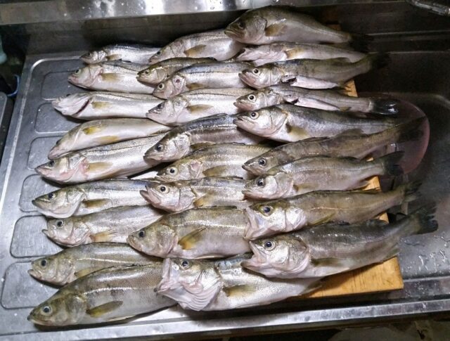 懲りずに北陸に仕事終わりから走り1ヶ所目単発でボイルが出ている場所が空いていたので入ってルアーを投げてみるのですが1度触っただけなのでエサにして探っていると食いました!セイゴを確保、次を狙いますが簡単ではなく何度も投げてやっと2匹目確保、同じ事をやっていては食わないので引くラインを替えレンジを変え巻きスピードを替えポツポツセイゴを追加して何とか7匹釣りますが もう無理!と場所を替わります。しかし次の場所では満月の影響か2つ怪しいアタリがありましたが掛けられず場所移動、次の場所ではボイルも無いのでエサから入り浅いレンジを引いていると食った!居るね~ 1匹確保してすぐに2匹目3匹目と釣って反応が無くなりココでシンペン小を投げるとゴンとヒット~いきなり食って来ました。ルアーで2匹目を釣ったところでネットに絡んだセイゴが暴れシンペンのフックが飛んでしまい当りシンペンをカラー違いにして投げるとコレが調子良く食って来ます!しかしバラシも多く3匹釣るのに3回もバラシていたのではアタリも出なくなりシンペン中にして投げるとガツン!といきなり食って来て慌てます。エサでもフォローを入れると食ってくれるので一気に数を稼ぎラストの移動ではルアーだけで狙うと 派手に当たるがなかなかガッチリ掛からずバラシ多数で2匹確保がやっとでした。後半ルアーで10匹エサで10匹、全体で27匹を確保して終了です。