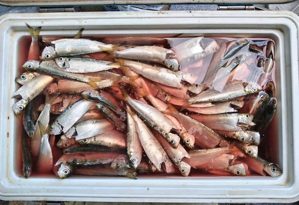 一晩目に休憩無しで釣りをしてしまい サッパの開始が9時になってしましたが投げてみると連掛けで上がって来るのでイケるかと思いきや失速1匹ずつを拾う展開に、新子が掛かり邪魔をされながらもポツポツ追加していて 前回と言い今回も食いが悪いのでピークは完全に過ぎた感じになりつつある中 潮目にゴミが溜まっているので投げたくはないのですがその際へ投げてみるとココから怒涛の追い込み!時折5連もあり2-3連が安定してそれも時折大きなサッパが釣れて来ます。少し長く頑張り12時に終了して数えると242匹と前半の不調もありましたが何とか200を超えましてセイゴも多めに居ますのでクーラーボックス満タンで二晩目の釣りは無しで帰って来ました。