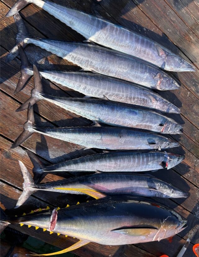 キハダキャスティングもいよいよ終盤戦という頃になってやっと行けました。今年は予約を入れていた日がことごとく時化るというこれだけ雨が少なく猛暑と言われた夏に酷い仕打ちを受けていた訳ですが、今回は凪も良く最高の釣日和。ウキウキで沖へ。鳥羽から向かうとポイントまでは結構な距離がありましたが前日ナブラがあった海域に到着すると大量の鳥たちがプカプカ・・・祭りが終わっている・・・不穏な空気が流れるもナブラを待つがただただ凪の海が広がるだけ。見るに見かねた船長がルアーを引っ張りだした。すると何かがヒット!暫くドラグが出たものの魚が寄り始める。姿が見えたのは何と40kg位のキハダ。無事船上に上がり港でみんなで分けるという話になった。その後も引っ張りながらナブラを探すが沖ザワラの猛攻に合い連続ヒット!一通り全員魚の引きを楽しんだところで港に戻ってきました。今年最初で最後のキハダキャスティングでしたが楽しめたのでよかったです。