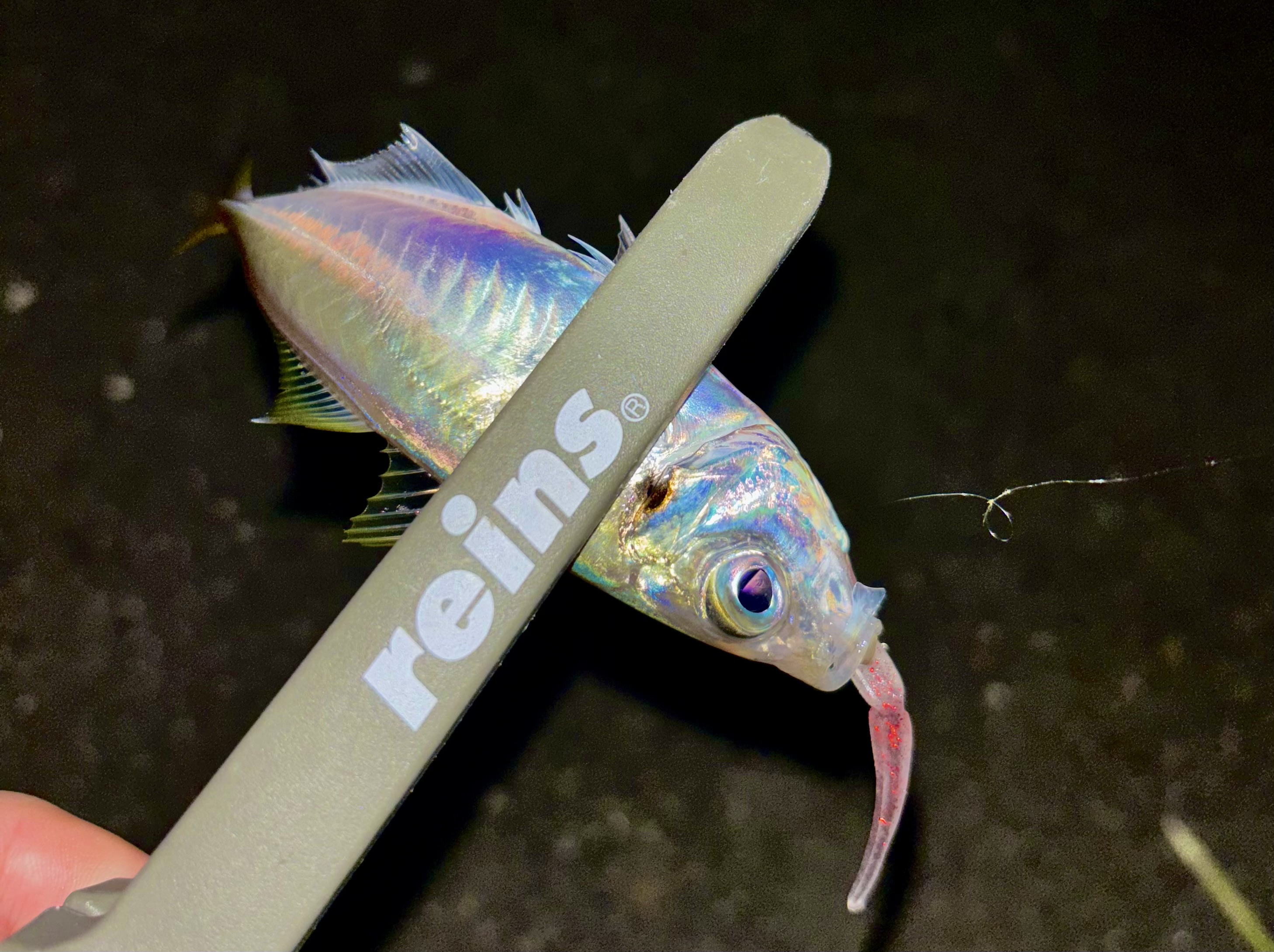 ぶっ込み用のエサが欲しいので、エギをやめてアジングへ!流れがキツめなので、サイコロヘッドファイン0.4gとセクシービー2inのセットを流れに乗せながら超ゆっくり巻いていく事で、豆アジとハタンポをキャッチ!