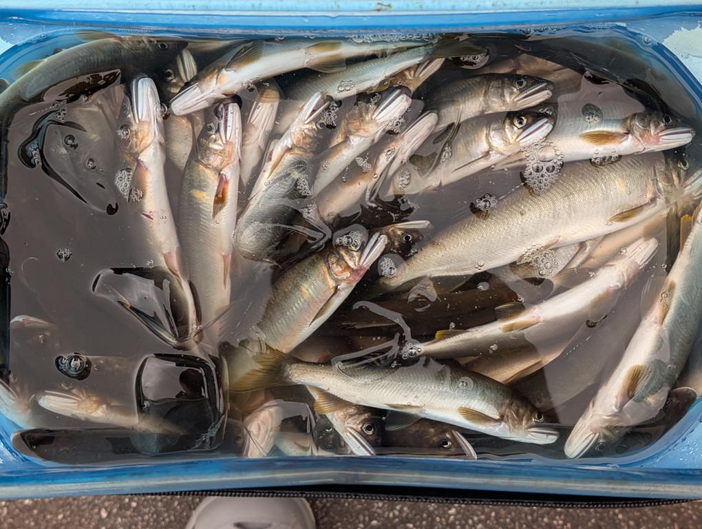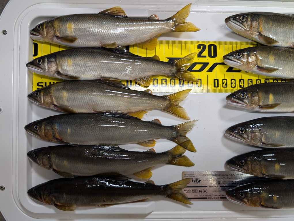 こんにちは~焼津街道店の三浦です。9月9日も前日に続き、絶好調の神通川での鮎釣り2日目。当日は朝7時30分頃に宿を出発し、悩んだ結果、8時過ぎから新婦橋の下流で釣りをすることに。開始すぐに流れの中で1匹目が掛かるも小さい。なかなかサイズが上がらず、瀬尻まで行くとようやくサイズUP、その後は泳がせに変更するとサイズも安定し、入れ掛かりモードに突入。13時までの5時間で75匹。昼食後は移動するか迷いましたが、人が少なくなってきた為、午前中とは違うポイントを釣り、17時30分頃まで楽しみ63匹追加し、138匹の釣果でした。鮎のサイズは11㎝~19㎝までと小さいですが、黄色い鮎が追って掛かるので楽しめました。新婦橋の下流では瀬の鮎は全体的に小さく、深みを泳がせで釣っている方は良型を揃えていました。※釣果写真は2日目の釣果の一部です。