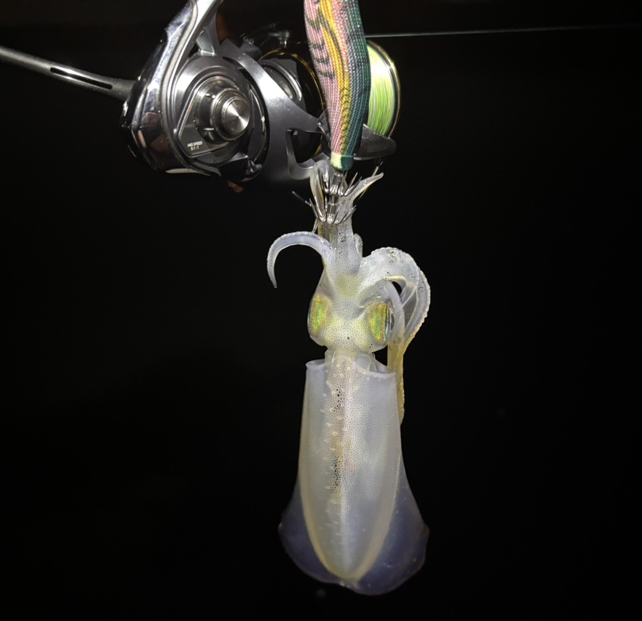 2匹目は潮が効いているポイントでフォールさせているとなんだか違和感、、合わせてみると可愛いイカが釣れました!!