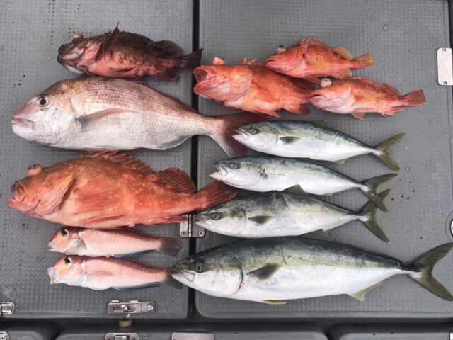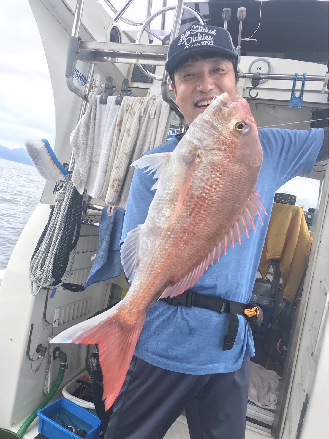 一つ目の110m位のポイントでガシと真鯛を釣り、同船者の方が50cmオーバーのウッカリカサゴ。その後どのポイントも渋く小型アマダイ☓2を追加し雨が降る前に納竿しました。