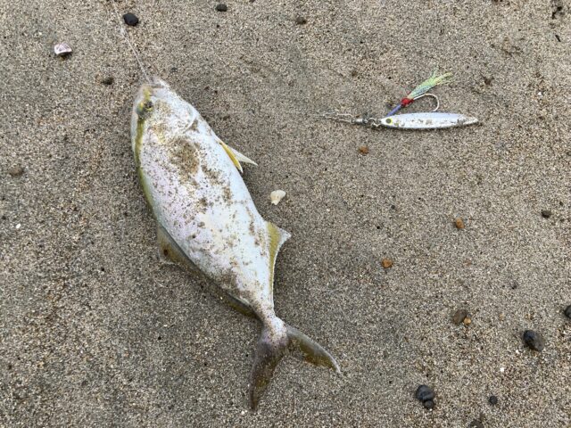 浜に着くとなかなかにいい雰囲気。向かい風で風速5m程あるので、飛距離は落ちますが、それでも90mぐらいは飛んでいます。着底させてワンピッチジャーク。時折テンションフォールを入れ、再度着底。これを繰り返します。するとガツンといいアタリ!…が乗り切らず。再度同じコースにキャストすると今度はヒット。30㎝あるなしサイズのシオでした。次も同じコースで連発。またまた同じサイズ。その後は雨が強くなってきて撤退しました。激しい雨が降る中でしたが何とか形になってくれてよかったです。次はサイズアップ目指して頑張ります!50オーバー来い!