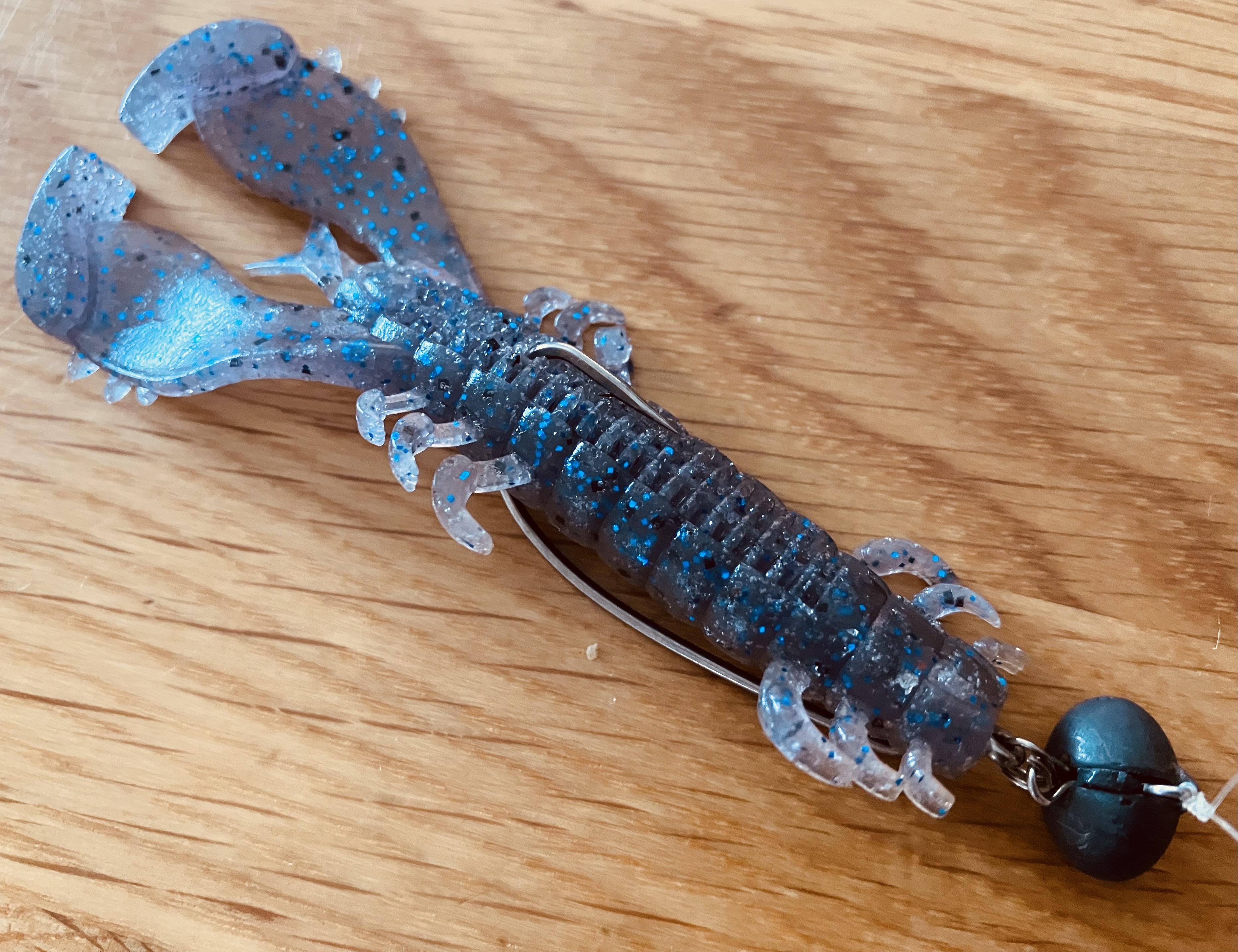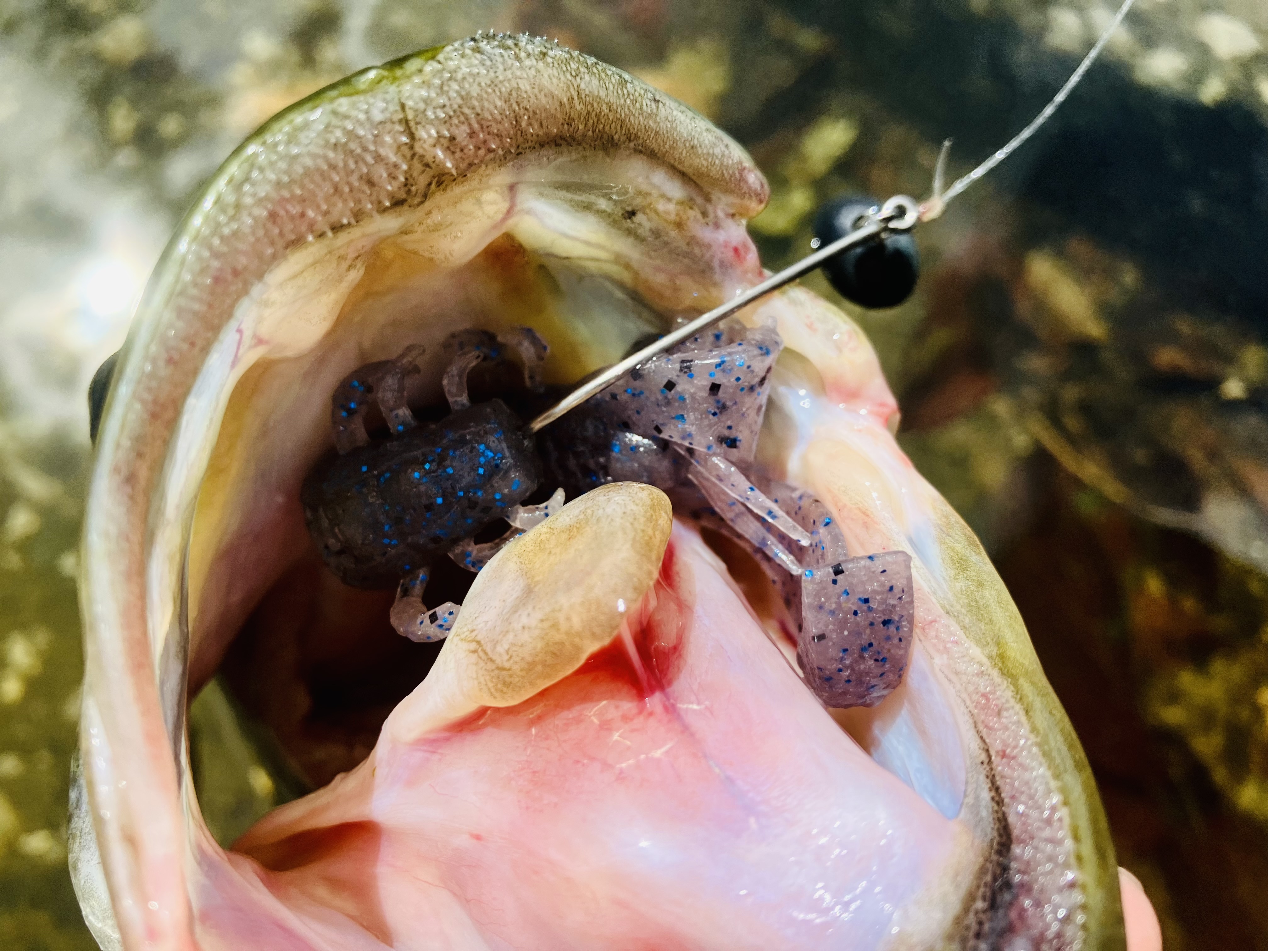魚の回遊が無く雰囲気が無くなったので、フットボールヘッド3/8oz+デプス/MSクローをセットし少し深いポイントをリアクションで狙うと気持ちいい吸い込みバイトで良型!