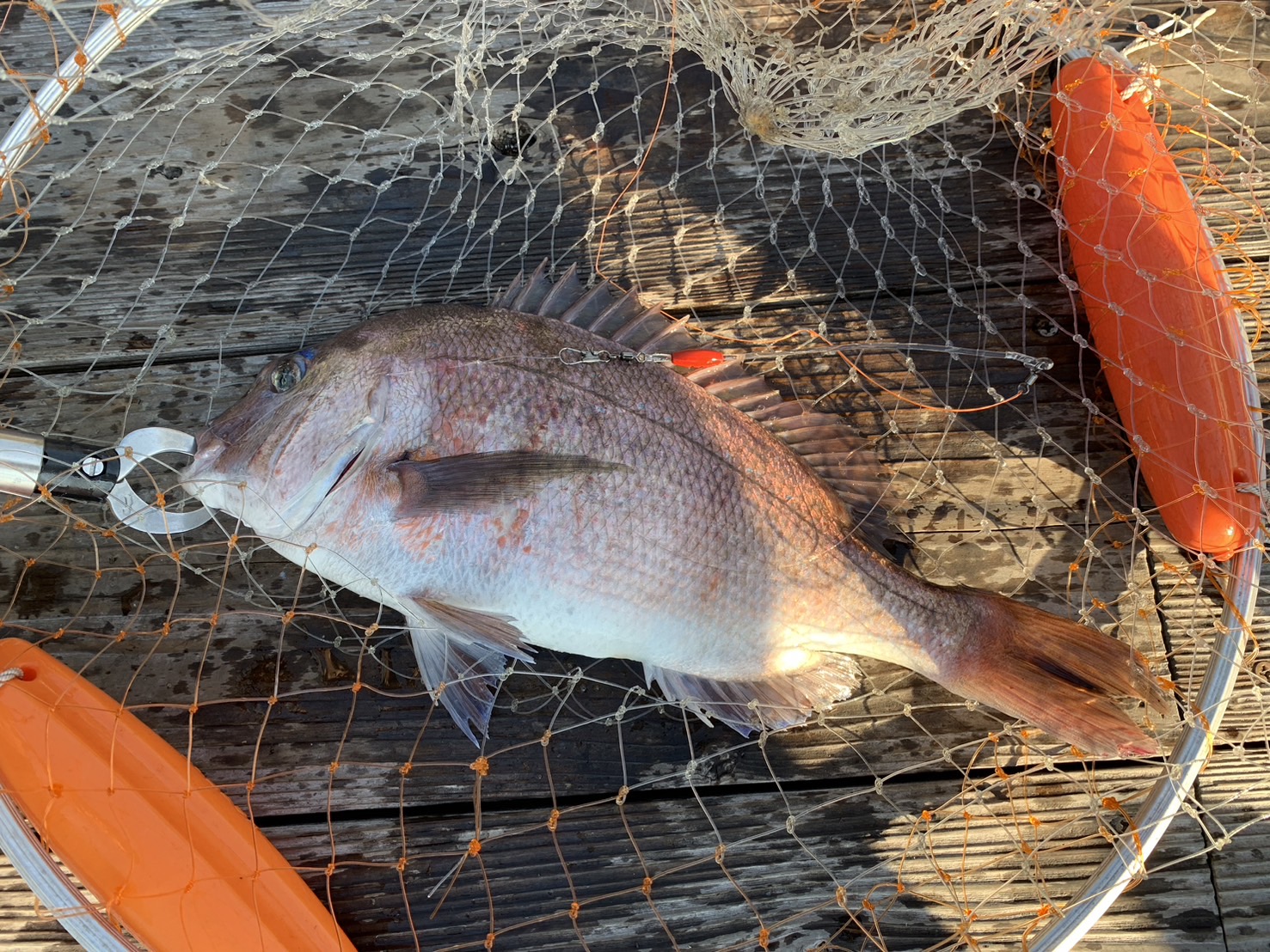 その後しばらくして調子を上げ、真鯛を2枚キャッチ!エサはそれぞれ練餌海道の「爆釣真鯛」と浜市の「カラーきびなご・ブルー」。その後、終盤にギリギリ滑り込みでマダイを1枚追加!エサは練餌海道の「〈女帝〉カイゼリン」でした!