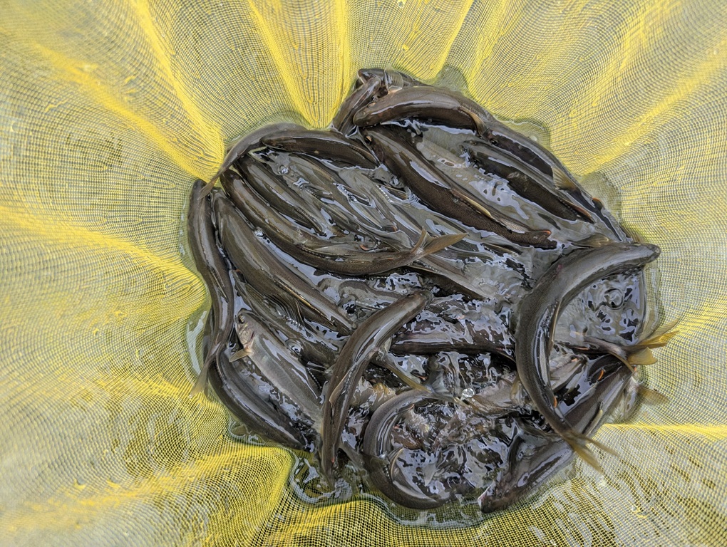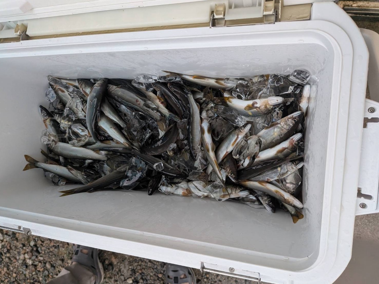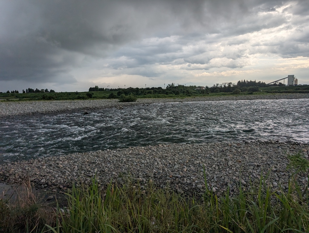 こんにちは~焼津街道店の三浦です。9月18日も神通川で鮎釣り2日目。フィッシング吉井さんで前日預けたオトリを回収し、前日と同じ新保橋上流へ。今回は左岸側から入川。朝9時過ぎから釣り開始。開始するとすぐに強雨と雷・・・先行者の4人はすぐに撤収し釣場には私だけに。雷が収まったところで釣り再開。左岸は前日同様にサイズが小さい。水位の上昇を気にしながら流れの中心へ。前日良型が揃った右岸を探るもこちらもサイズダウン。増水と濁りの影響なのかたまに良型が掛かるものの平均サイズは15㎝くらい。白い鮎が多くアタリも弱い。それでも鮎はいっぱいいるので掛かり続けます。13時までに72匹。車に戻る途中に分流に鮎がたくさんいたので、午後からは泳がせで狙ってみると黄色い良型連発。約2時間泳がせを楽しみました。16時頃には本流の濁りも薄くなってきたので、ラスト1時間は流れの中心を釣り17時まで楽しみ34匹追加し106匹の釣果でした。2日目は前日に比べて全体的に鮎のサイズが小さく、平均サイズは15~16㎝くらいでした。神通川はこれで最後にしようと思っていましたが、これだけ釣れるとまた行きたくなりますね。18日は水難事故が2件ありました。神通川は見ため以上に流れが強いので、無理に立ち込んだりしないこと、根掛かりなどを外す場合も絶対に無理をせずに仕掛けは切って下さい。私も今回の釣行で仕掛けを6セットダメにしました。安全第一で鮎釣りを楽しみましょう。※タモの釣果写真は午前中の釣果です。