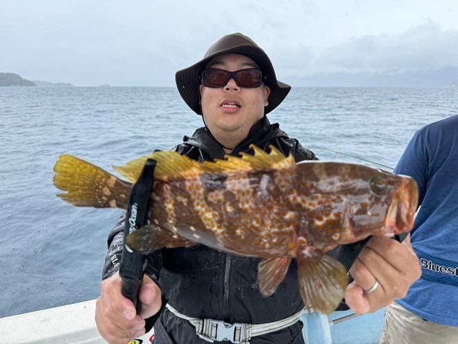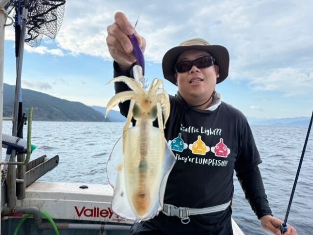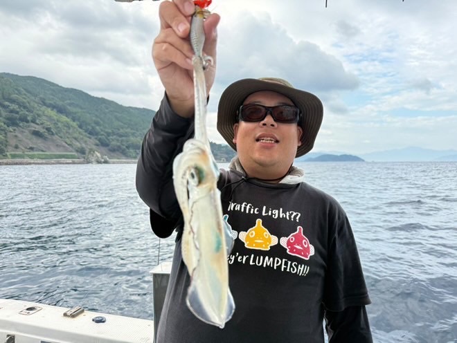 刈谷港店メンバーで日本海のティップランに行ってきました!お世話になったのはビッグフィンスクイッドさんです。朝イチから反応があり、ティプランナー3.0号でアオリが上がってきました♪朝イチの赤テープ系はやはり効きます♪その後、曇りだったのでコノシロシルバーで追加できました。周りでは王道のパープル系も良く当たっていていましたが豪雨の影響もあってボトムをとる事が困難になりましたが当店柴田はそんな状況の中でも着実に数を伸ばしていました!自分は7杯でしたが柴田は14杯♪流石ですね!終盤にはエギに良型のキジハタが食ってきました。思わぬお土産GETです♪これからまだまだ良くなってくると思います。秋の日本海ティップラン、アタリも多くオススメです!行かれる際はティップランナーがオススメです!船長さんもポイントを熟知されているので楽しめますよ!