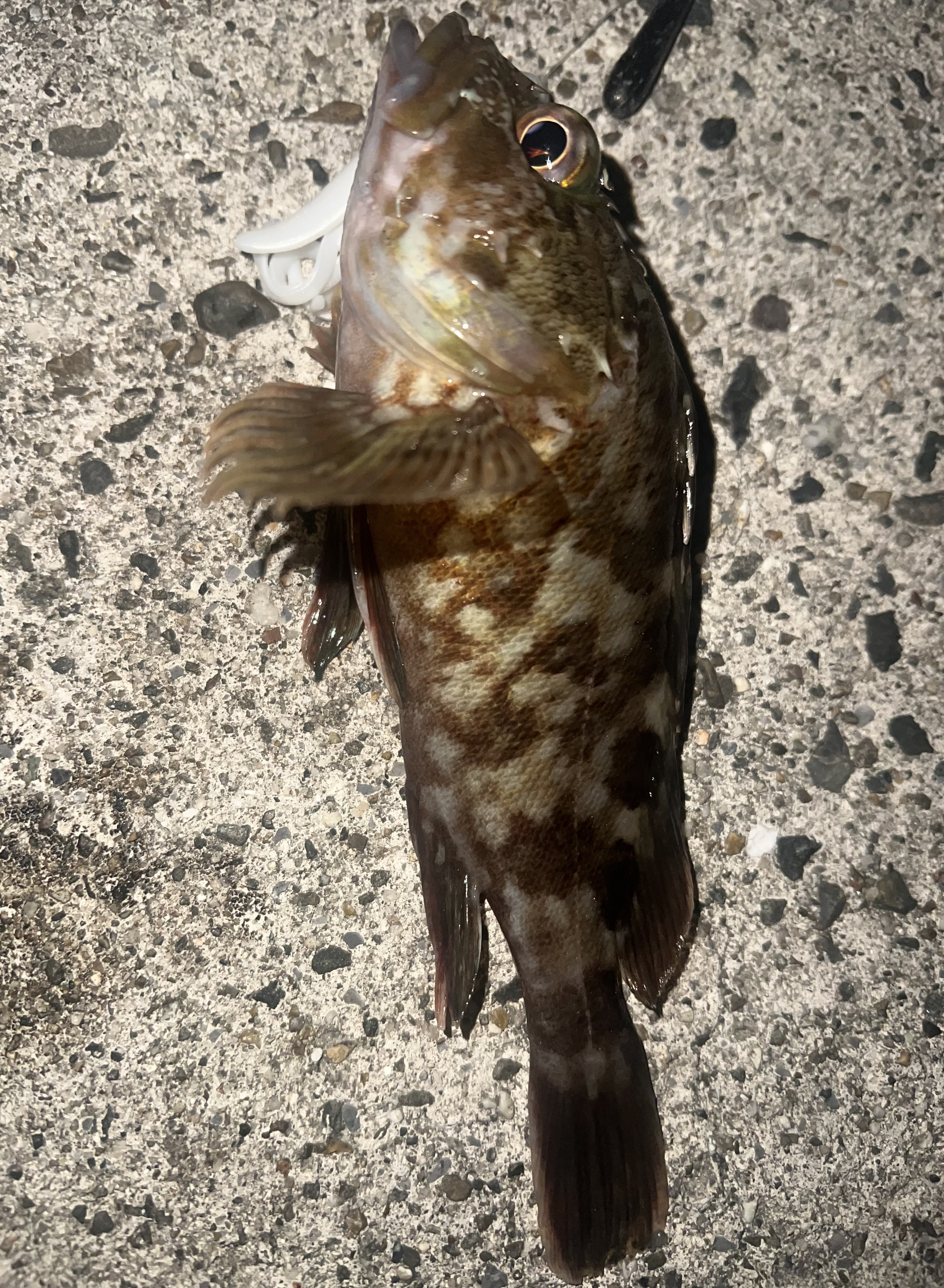 この日はエギングに行く予定でしたが、風が強すぎるので中止に…それでも釣り欲が抑えられないのでキジハタを狙いに行ってきました。この日はどの釣り場を回っても全然人が居ない。風裏になるポイントを探していざ釣り開始!いつも通りボトムパンプするも珍しくアタリがない。そこでリフトアンドテンションフォールに切りかえ、フォールを長めにとってみると、ごごっとしたアタリ!釣れてくれたのはそこまで大きくないカサゴちゃんでした。その後もテンションフォールやステイを繰り返して移動しながら釣り進めていくと、小さいですが本命のキジハタに会えました!この日メインで使用したのはエコギア様のバグアンツでした。だいぶ夜も涼しい季節になって来ましたので、ぜひ釣りに行ってみてはいかがでしょうか?