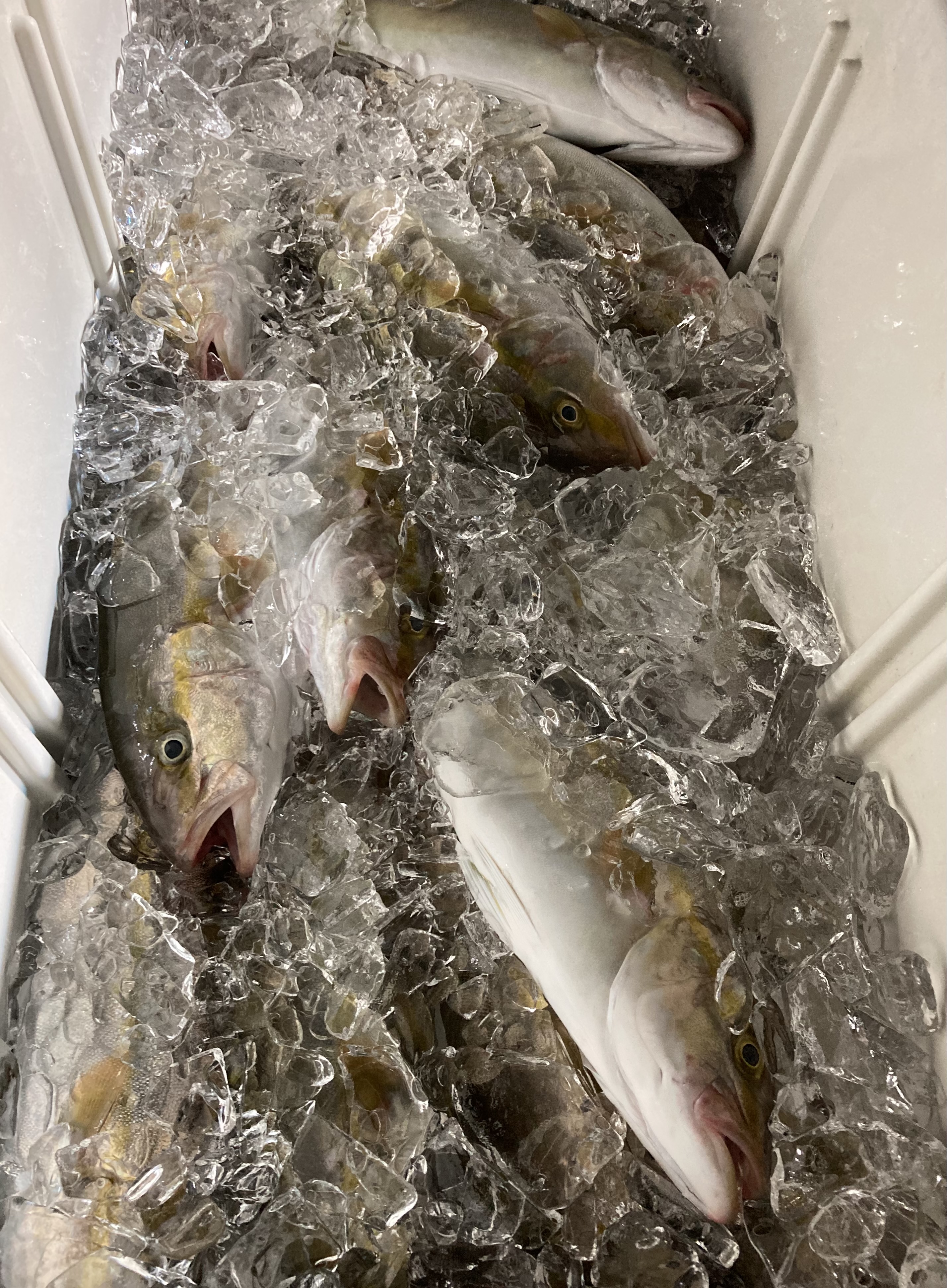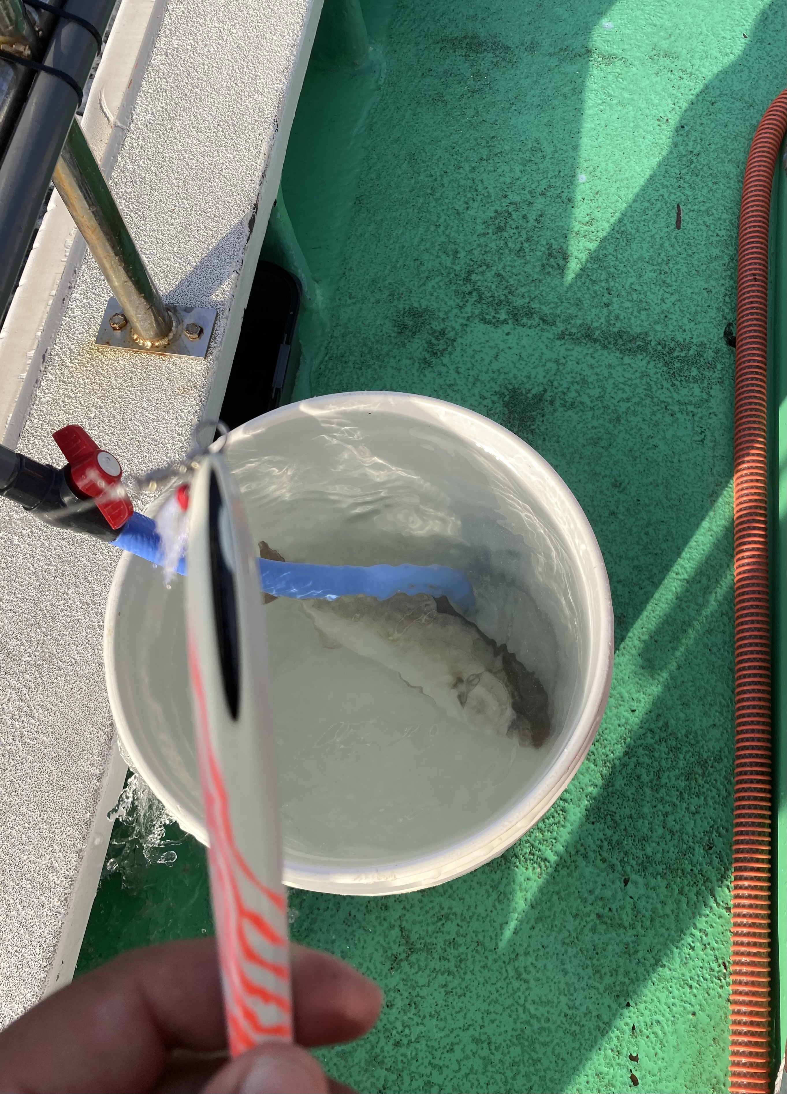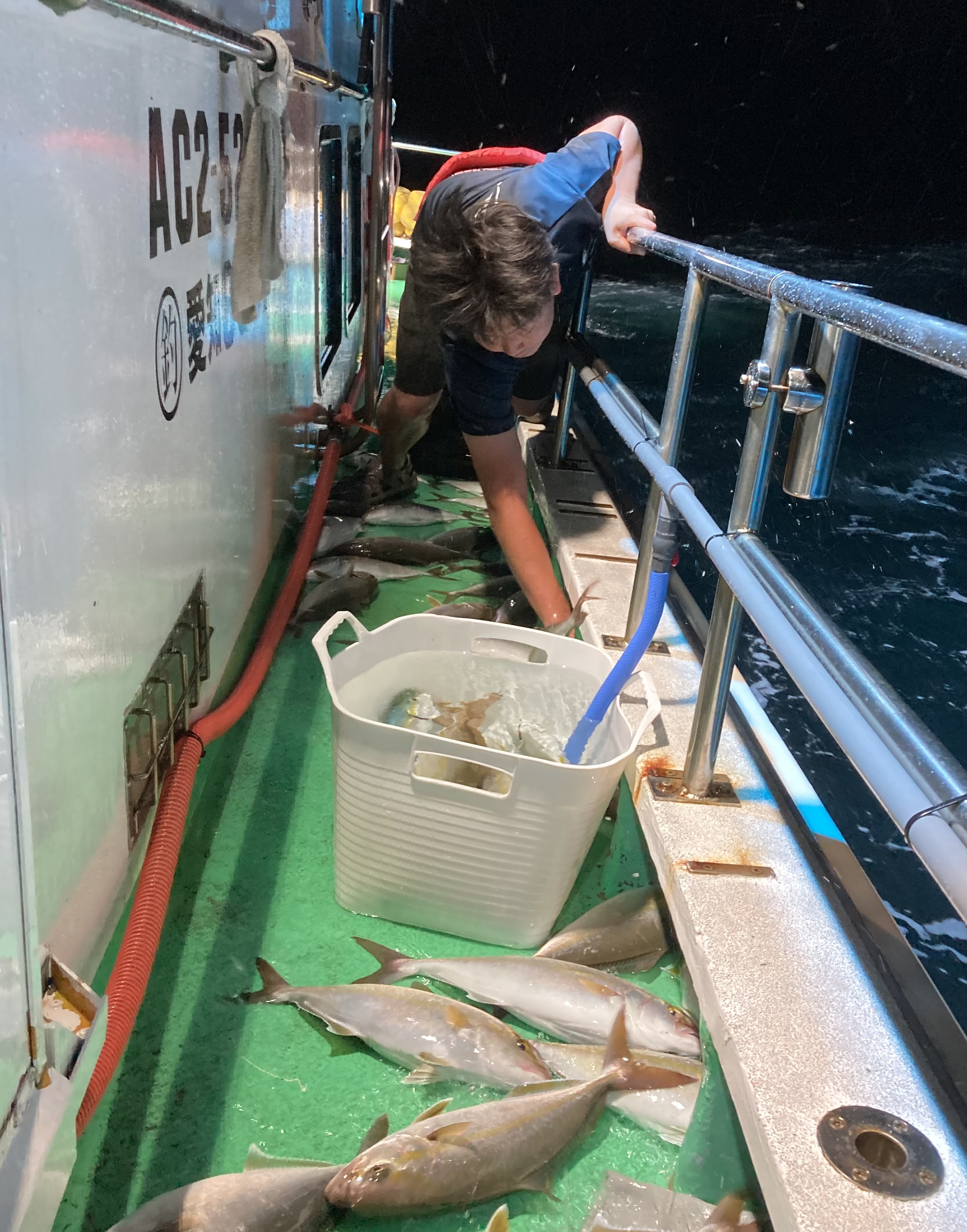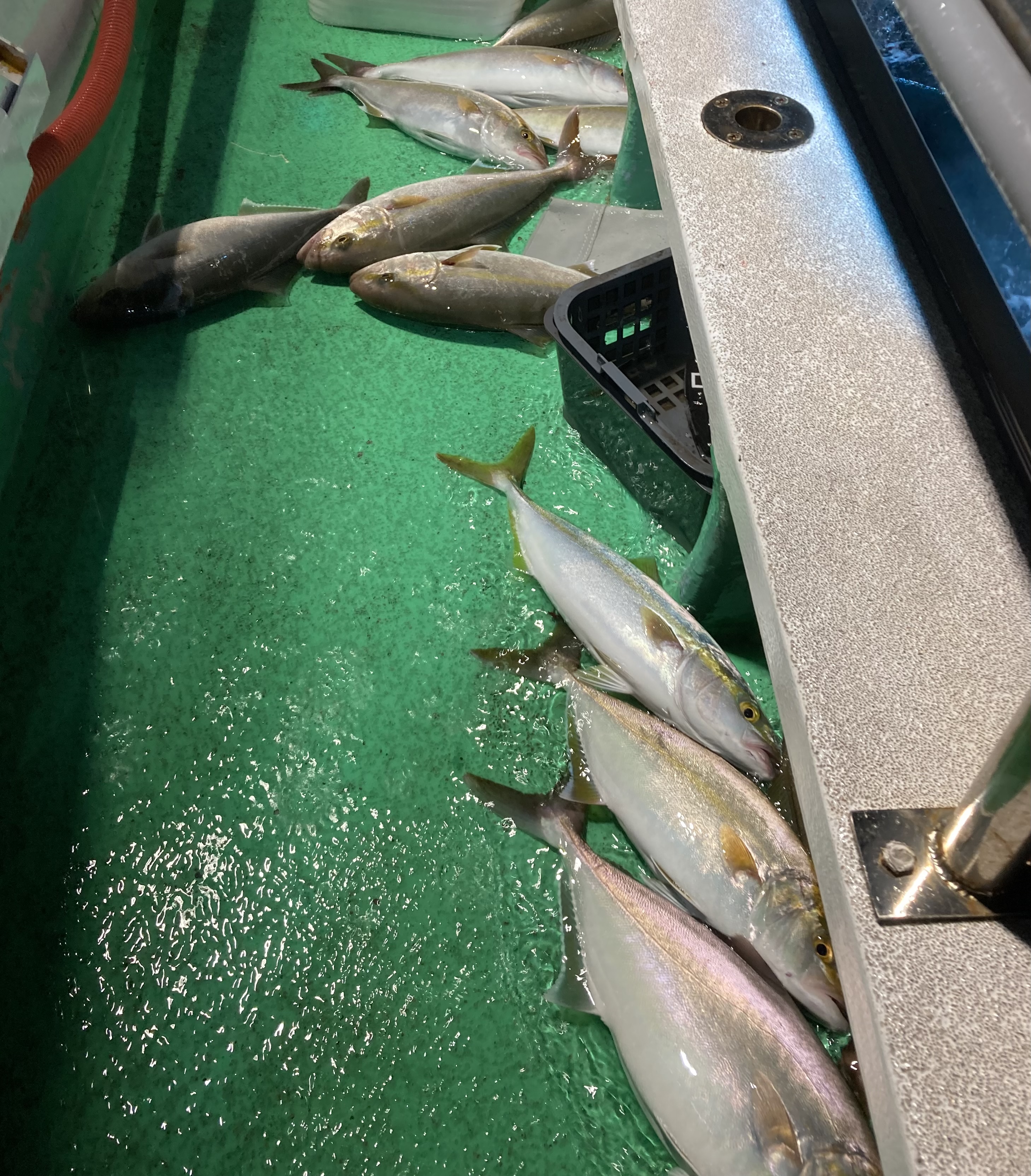 毎年9月~10月といえば第3銀狼丸で出船している午後便のカンパチジギングが盛期を迎えます。時合いになれば30~60cmのカンパチがボコボコのボコに釣れるアドレナリンMAXな釣りです。昼間の前哨戦はミヨシと右舷にいい所を持っていかれ、いいとこ無しでしたが本番はマズメ時。ガレージナギのドレッパーで先ずは40cm程をキャッチ。棚が上がってきてからは軽めのチビウロコショートでも連発でした。途中からインチキをしたりしましたが、最終は26匹ほどでした。(魚が足元に転がりまくっているのでどれが誰の魚とか分からなくなります)Maxサイズは48cm。60オーバーを狙っていたのですが今回はお目見えならずでした。時期限定のこの釣り、みなさんも行ってみてください。タックルなどの相談は刈谷港店までどうぞ。お待ちしております。