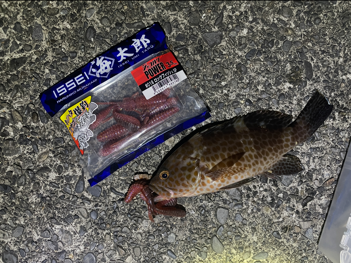 まずは一誠『ジャコバグパワー3.5in』でやっていきますが、反応が無い為、OSP『ドライブクロー2in』に変更します。しばらくリフト&フォールしていくとフォール中にアタリ!合わせてヒット!15cm程のカサゴでした。リリースして再度『ジャコバグパワー3.5in』でリフト&フォールするとまたフォール中にアタリ!今度はオオモンハタが釣れました!リリースして終了しました。