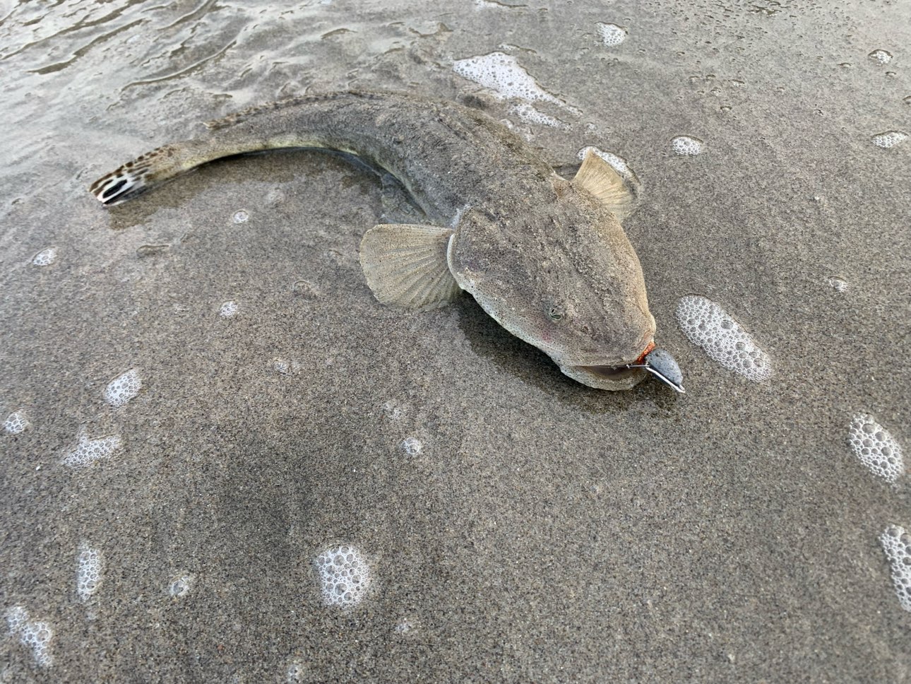 遠州サーフへ行きました。波が高くて釣りにくい状況でした。こんな日は釣りをしない事が多いのですがマゴチなら釣れると思い、ぶっ飛び静にボーンベイトをセット。しばらくボトムを引いているとアタリが出ました。フッキングするとすっぽ抜けてしまい、ワームだけがズレていました。ワームをフリルドシャッドに変えてボトムを探るとまたアタリ。今度はしっかりフッキングしてキャッチしたのは50cmくらいのの肉厚マゴチでした。波が落ち着けば青物もまた釣れる様になると思います。