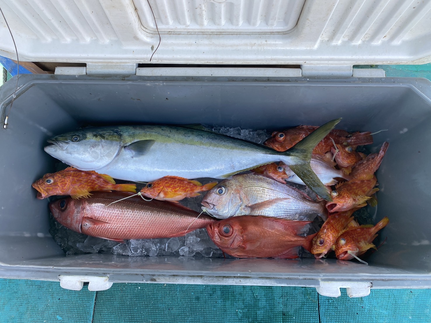ドスンときてファイト開始。隣のお客さんともほぼ同時ヒット。僕の方は始めはよく引いたものの、なにやら赤い…。それでも70センチ近いハチビキをGET。隣の方はブリ!