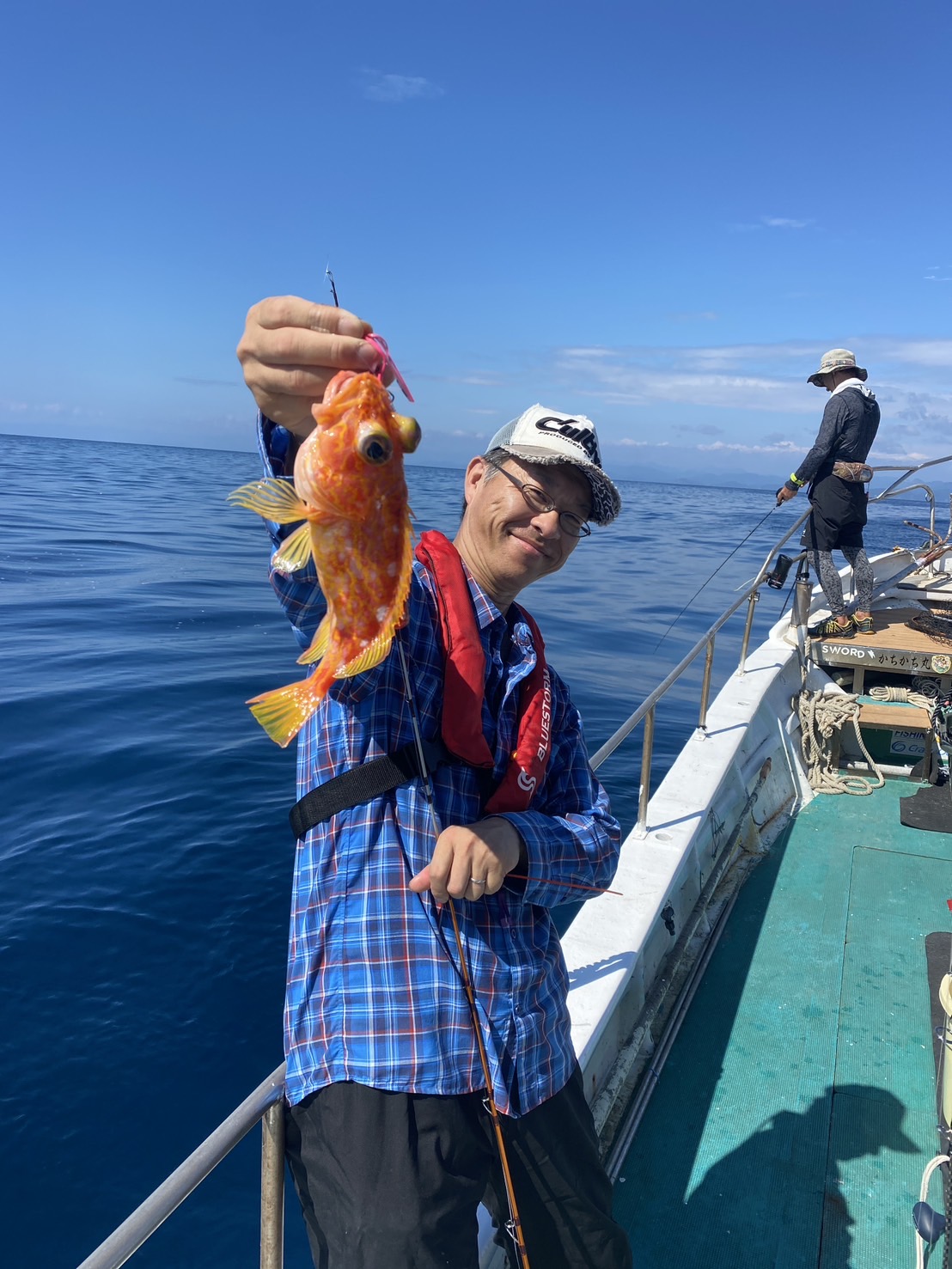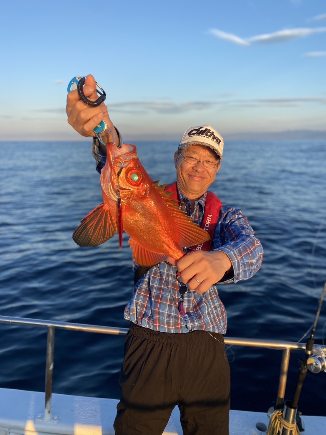 明るくなると同時に流れもなくなり昼前までタイラバで根魚タイム。途中でアシストフックにホタルイカをつける必殺ジャーク?をしてまたも2人してヒット!お客さんはバカでかいミズウオをGET、僕はオキザワラをバラシ…。