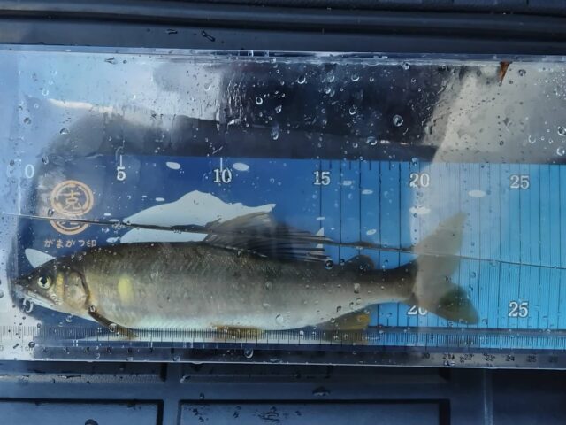 川沿いを上流へ走っても、この日は比較的釣り人が少なく、郡上方面からの256号線との交差点上流、板取地区へ入川し、17度の気温に寒さを感じつつ午前8時前に釣り開始となりました。スタートダッシュは阿部さん。上流側の浅いトロ場で、開始早々連発します。日高店長も負けじと瀬肩で連発します。「こんなに寒い朝から掛かるのかなぁ?」と、二人の様子を後ろから見ていましたが、そそくさと下流側の瀬でオトリ鮎を放しました。が、私の方は反応が無いまま1時間経過しました。。。浅い瀬脇でようやく1尾取れてから、23cmの良型をまじえてポツポツ掛かり、15尾で昼休憩としました。