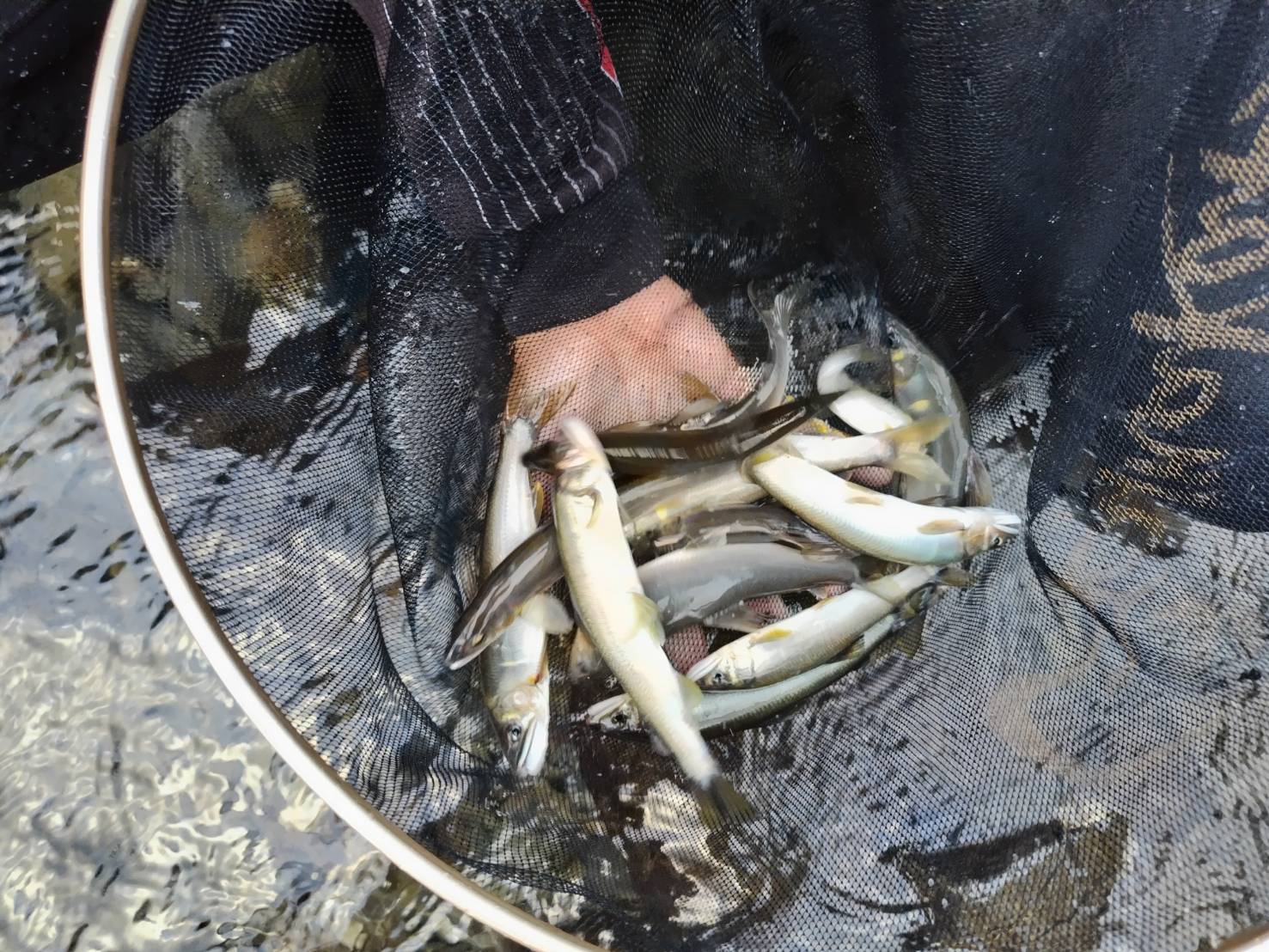 午後は少し下流の鍵穴(かぎあな)地区へ移動し、平瀬~ザラ瀬~浅いトロ~チャラ瀬へと、変化に富んだポイントです。再開早々、長男の目にも水中の閃光が飛び込む瞬間が訪れ、慣れない手つきで取り込みます。そしてこちらも慣れない手つきで鼻カンを通しオトリ交換、逆バリをセットして送り出し、先ほどよりも下流で目印が走ります。これも取り込みはバタつきます。少しずつ移動してドタバタ・ハラハラ・ドキドキしながら数尾取り込んだところで、「楽しぃ~~!」と笑顔です。これを見て私も竿を出すことにしますが、この時すでに15時半を過ぎておりました。17時頃までで5尾取り込み、後ろ髪を引かれる思いの中納竿としました。長男も出来過ぎの二桁釣果となりました。