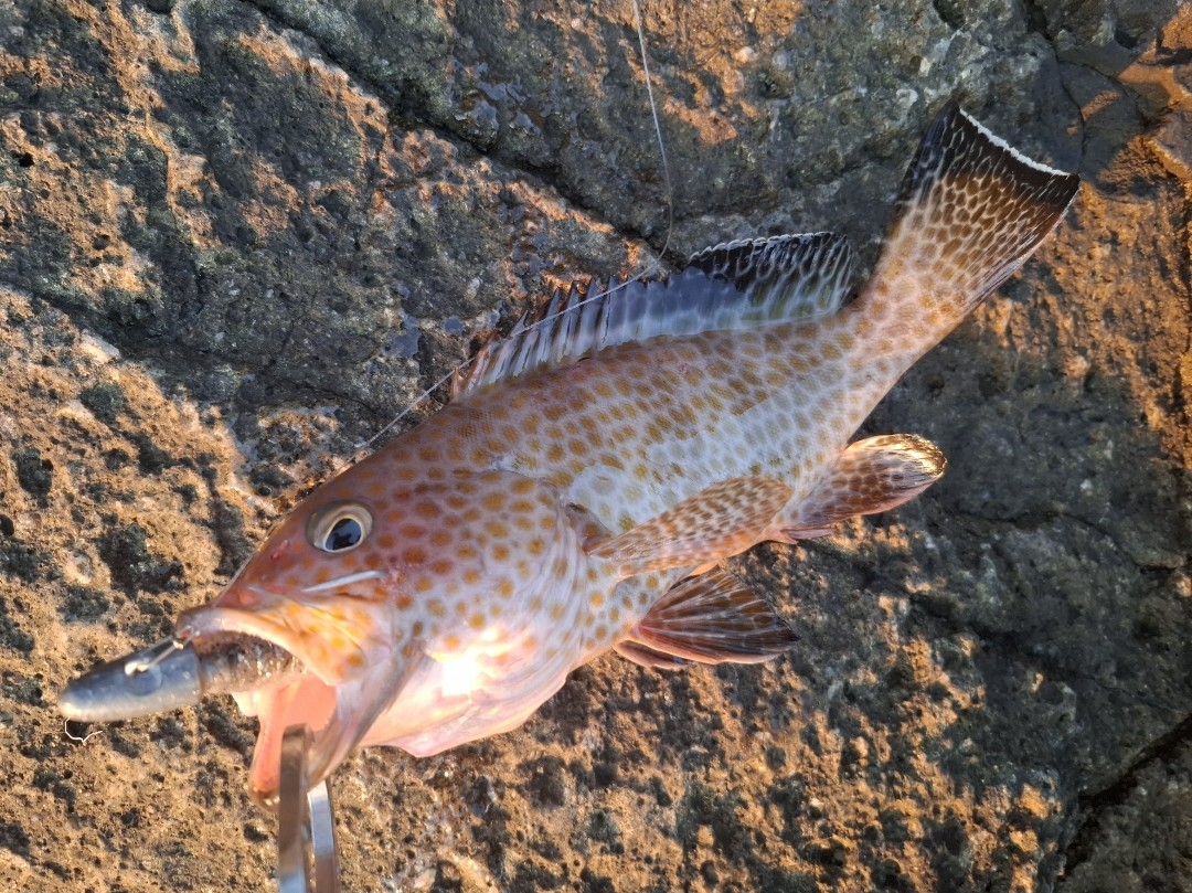 最初のポイントではオオモンハタやオニカサゴ、ワカシなどが釣れました。8時の見回りに来た際に磯を変えてそこからは良型アカハタがよく釣れました。