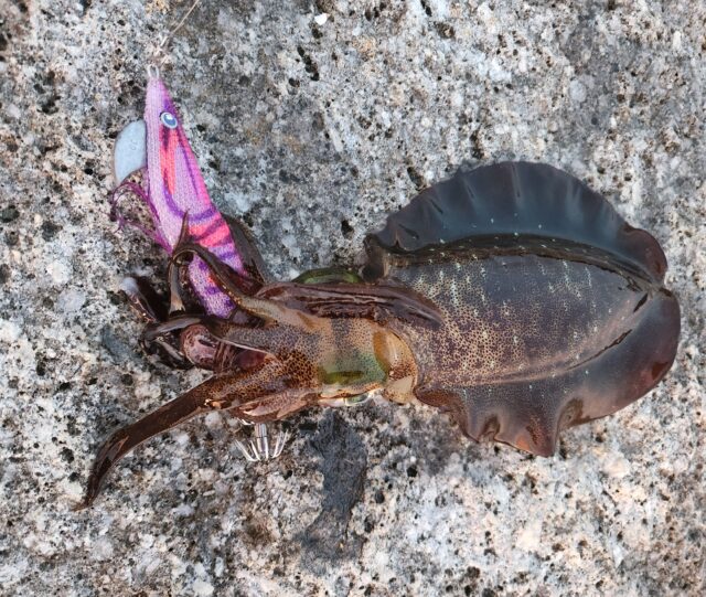 浅いところだったので着底させずキャストして6カウントからシャクリます。テンションフォール中にツンとアタリ!秋イカらしいサイズのアオリイカが釣れました!