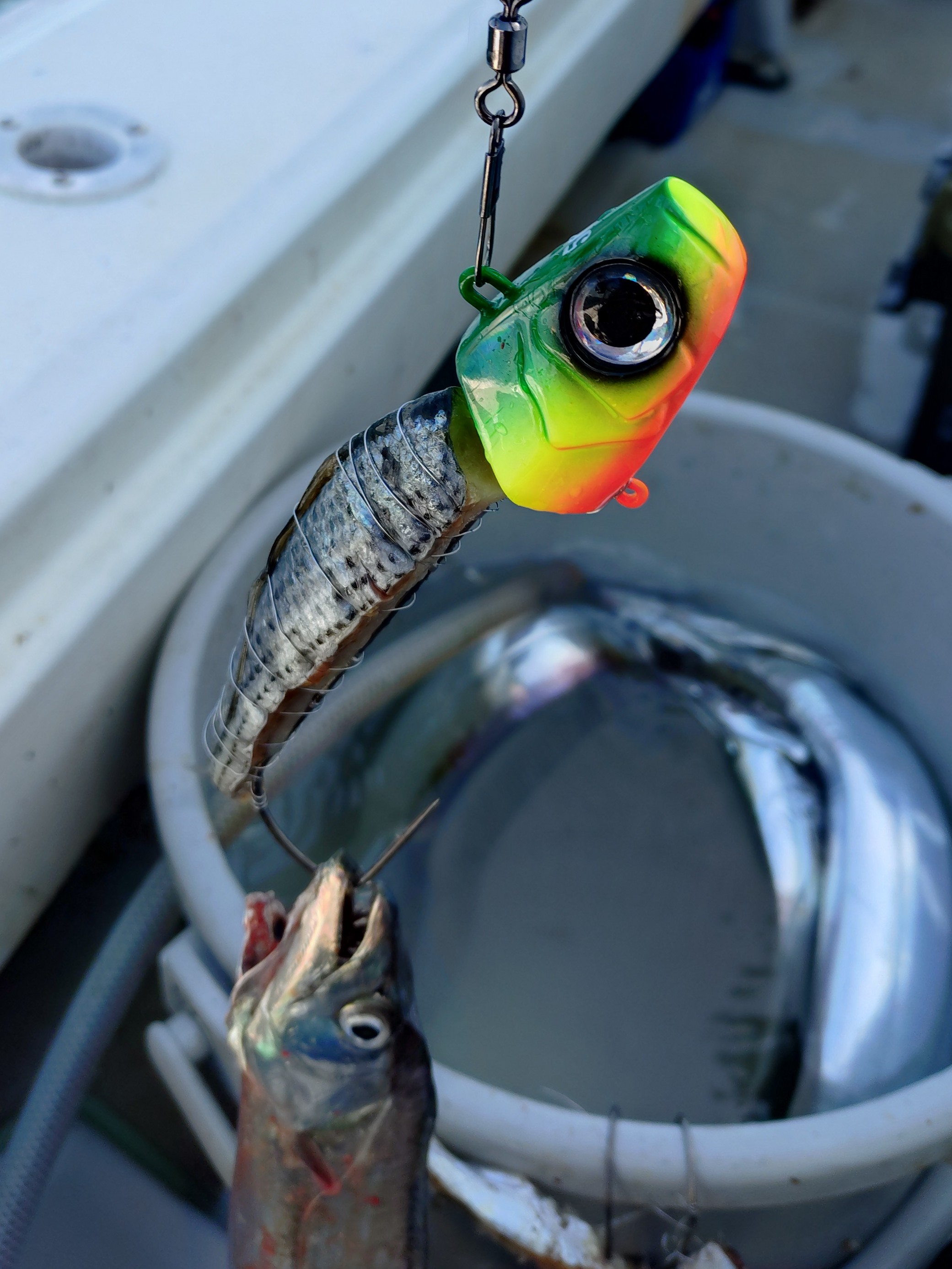 1日通して竿でのアクションにはほとんど反応無く、ほぼ全てのアタリが等速巻きの最中でした。朝のうちは微速巻き、昼頃はやや速めの巻きに反応良かった気がします。