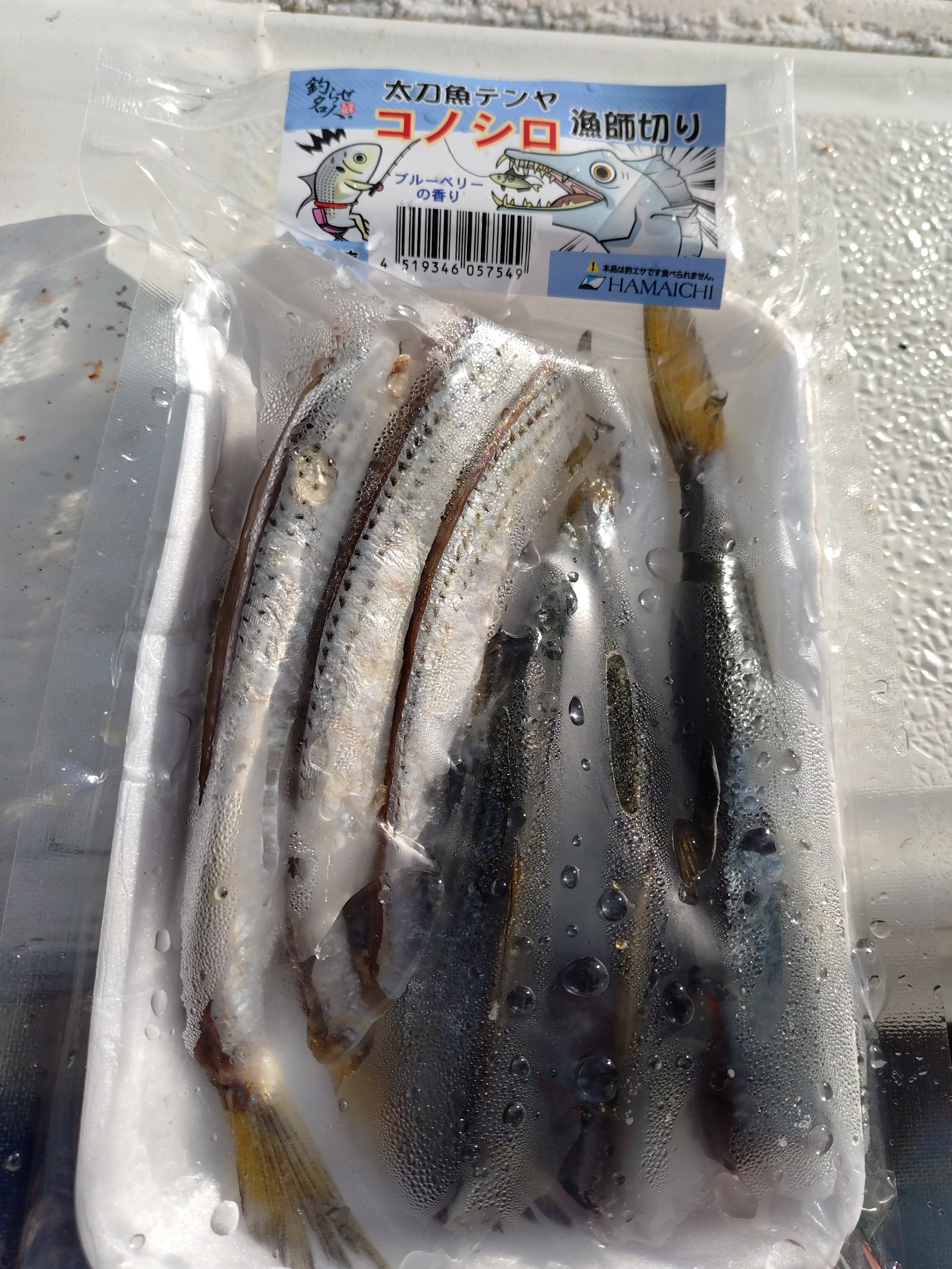 途中、アタリが多い故にイワシエサがすぐに千切られてしまうことが多くなってきたため、エサを浜市の「コノシロ漁師切り」に変更。こちらのコノシロが非常にエサ持ちが良く、タチウオを4〜6本釣り上げてもまだ使えるくらい身崩れしないため、エサを付け替える手間が減って手返し良く釣りができました(8時前から釣り終了の12時半までコノシロ1パックでもちました)。さらに、活性が高いのもあってかイワシと比べて食い渋られるようなことも無かったです!