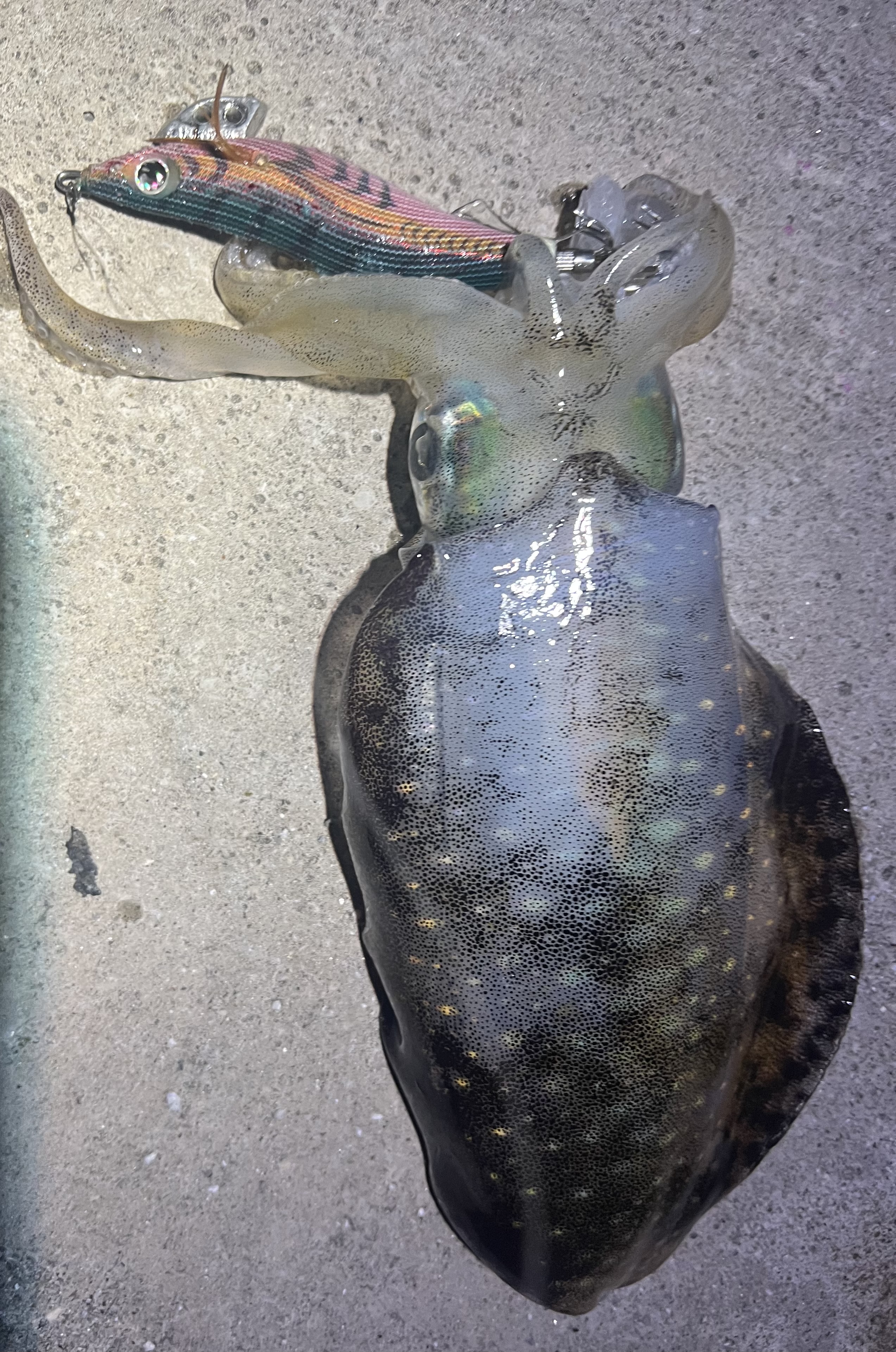 この日は大学終わりに知多半島方面に釣りしに行きました。夕まづめに間に合うと思っていたものの、着くと既に暗い…釣り人も続々と帰っている途中でした。少しだけやってアジングしようと思い、とりあえずヤマリア様のエギ王K2.5号を投げます。テンションフォールさせていると、ボトム直前でぬっと持ってかれたのでフッキング!釣れたのは240gのアオリイカでした。そのまま同じ場所にキャストしてしゃくってくるとこんどは370gのアオリイカが釣れてくれました!カラーは両方とも軍艦グリーンです。30分で2杯釣れたので十分と思い、納竿してアジングに向かいましたが、あまり釣れませんでした。知多エギングはサイズも良くなってきましたのでぜひ行ってみてください!