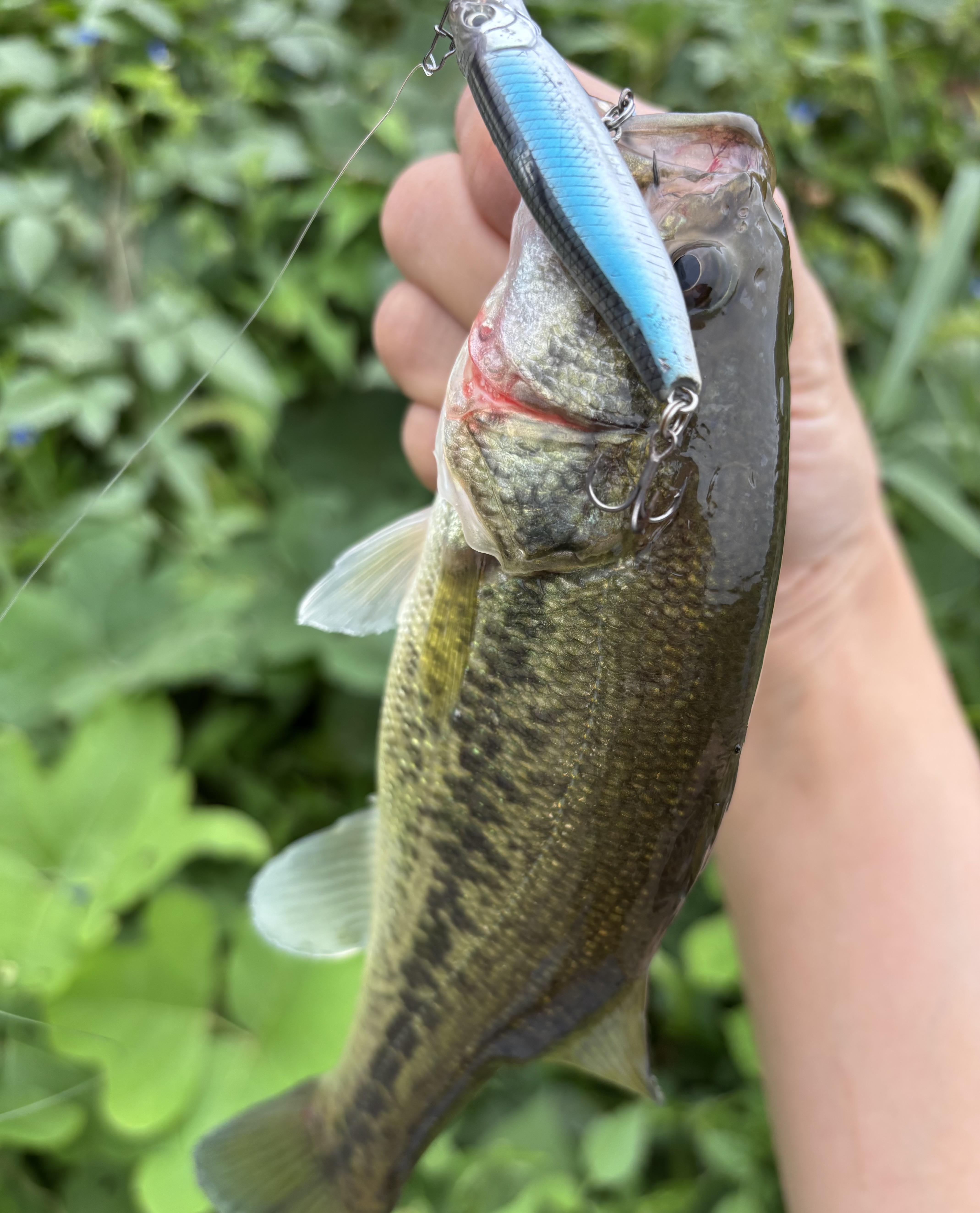 一誠カネヒラシャッドが良いとの事ですが、反応なく、アメペンに変更してすぐ落ちパクで気持ちいいアタリ!がジャンプでバラしてしまいますが、すぐにᕼITチビですがトップで釣れると気持ちいいですね😊