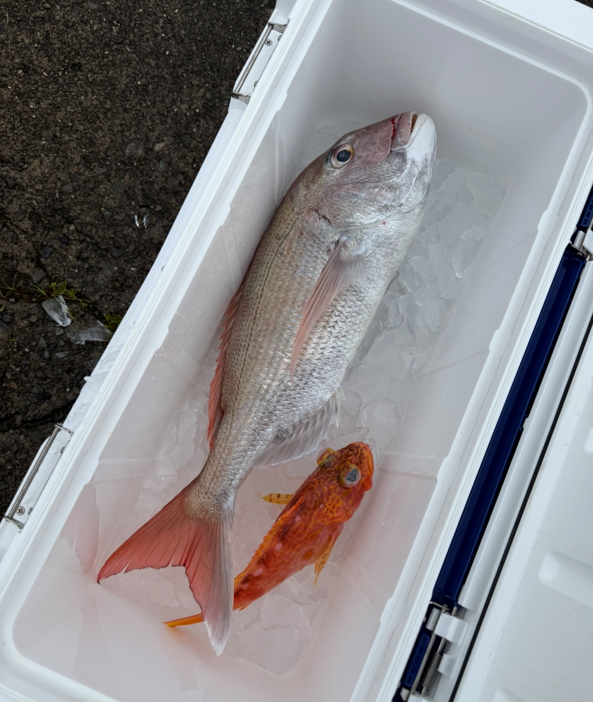 スピネギを教えてもらうために尾鷲ゴールデンイーグル様へ行ってきました!当日は台風と台風に挟まれた天気図ということでギリギリの戦いに!出船できたことに感謝です。ロッドは船長からお借りしてスタート!案の定うねりありですがやれないことはないため水深100〜110mくらいを狙っていきます。とにかくハーフピッチや4分の1ピッチで巻くのが難しい、、、。ぼちぼちやれていたようですがワンピッチと違い動きがバラバラになりますしロッドとリールのバランス(ギア比だったりサイズ)も必要なのがめちゃくちゃにわかりました。スピネギは正直完敗でした!これはリベンジします(笑)と、いうことで得意なタイラバに持ち替えてスタートするといきなりアタリ!あれだけジグに無反応でしたがタイラバには勝機。必勝パターンの海毛虫カーリーのしらす星にやはりヒット!60センチほどのいい真鯛が釣れました。そのあともアヤメ、レンコ、船中ではオニカサゴが。今回は天候が絶対的に影響しておりましたが楽しい釣りになりました!次はスピネギで釣果を、、、。ゴールデンイーグル様では釣れた魚でビンゴ企画も行っていますので2回目以降はより楽しめると思いますよー!ぜひ!