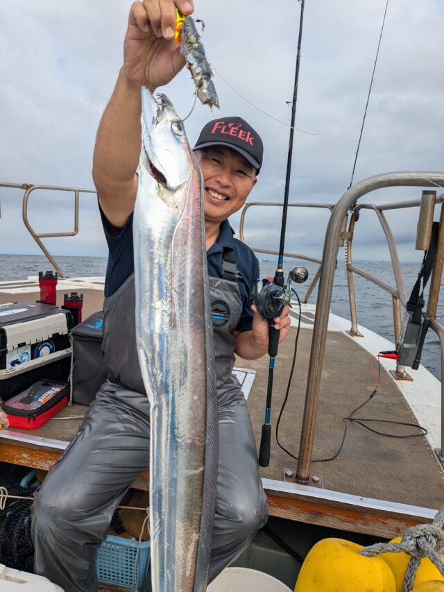 今回はテンヤとジギング両方準備して漁盛丸さんに太刀魚狙いで行ってきました。台風のうねりの残りか朝の間風は無いのだが大きな波長の波がある感じで水深80m程のポイントに到着。取り敢えずジギングで様子をみようとシャクってみるといきなりヒット。レギュラーサイズの太刀魚が上がる。その後も入れ食いとは言い難いがポツポツヒットし順調に数が伸びてくる。大きくポイントを変えると船長からのアナウンス。期待してテンヤの準備をし次のポイントへ・・・今度は90~100m程のポイントで早速テンヤを落としタナを探りながら誘ってくるとしっかりと竿を持ち上げてくるアタリ。すかさずフッキングし巻き上げ始めるとそれまでとは違った重みと引き。少し深いので慎重にやり取りをし無事船上にあげたのは1.09kgの良型の太刀魚でした。その後もポツリポツリと比較的良い型の太刀魚が釣れて大変満足でした。最後に天気が時化てきたので沖上りとなりました。まだまだチャンスはありそうです。皆さんも是非チャレンジしてみて下さい。今回のヒットルアーはクレージーオーシャンのメタボスイマー200g、テンヤはジャッカルのアンチョビドラゴンテンヤ50号プラス塩締めイワシでした。