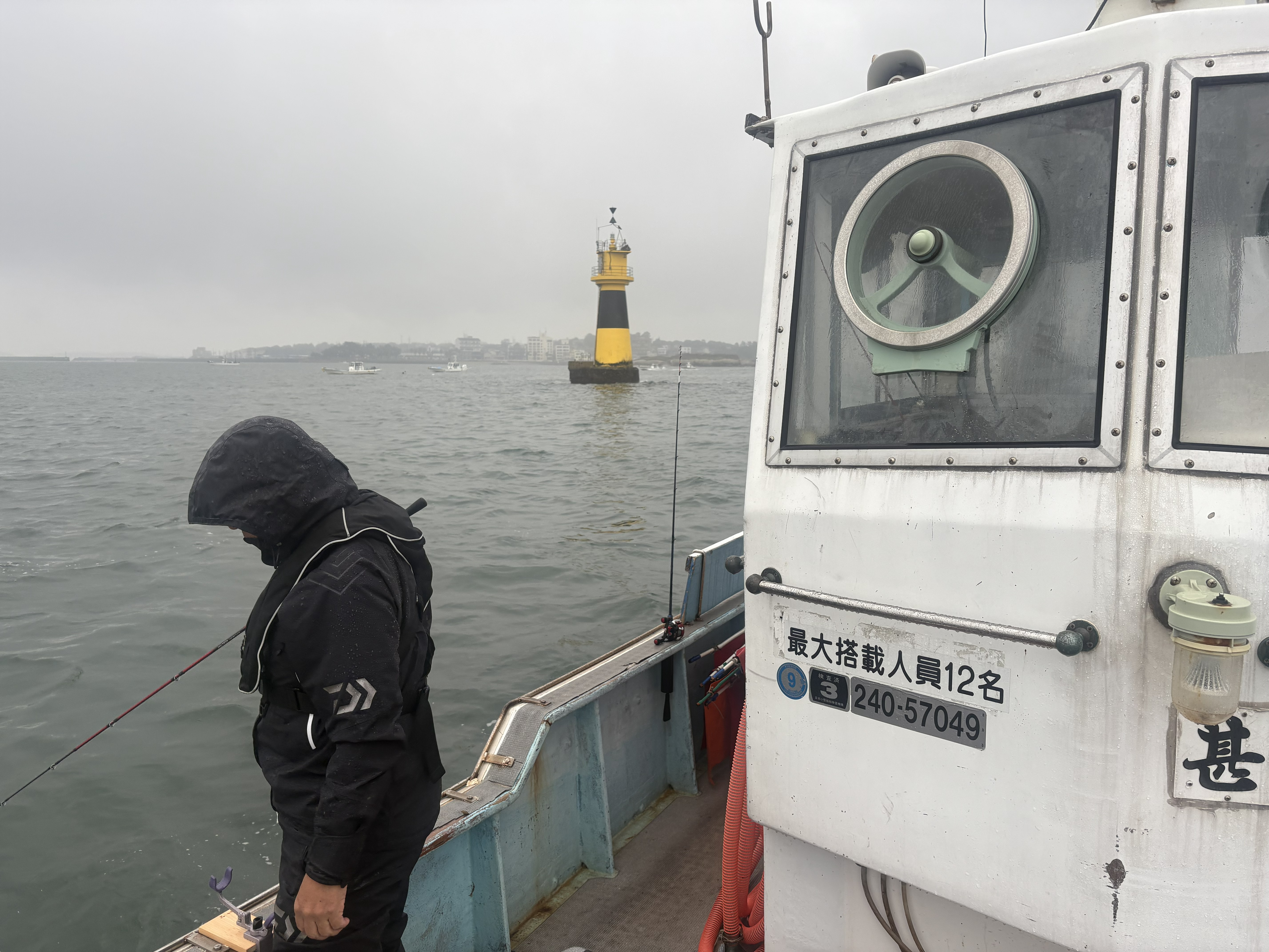 小雨が降る中、片名港6時に出船し、まずは港近くのポイントでカサゴを狙います。