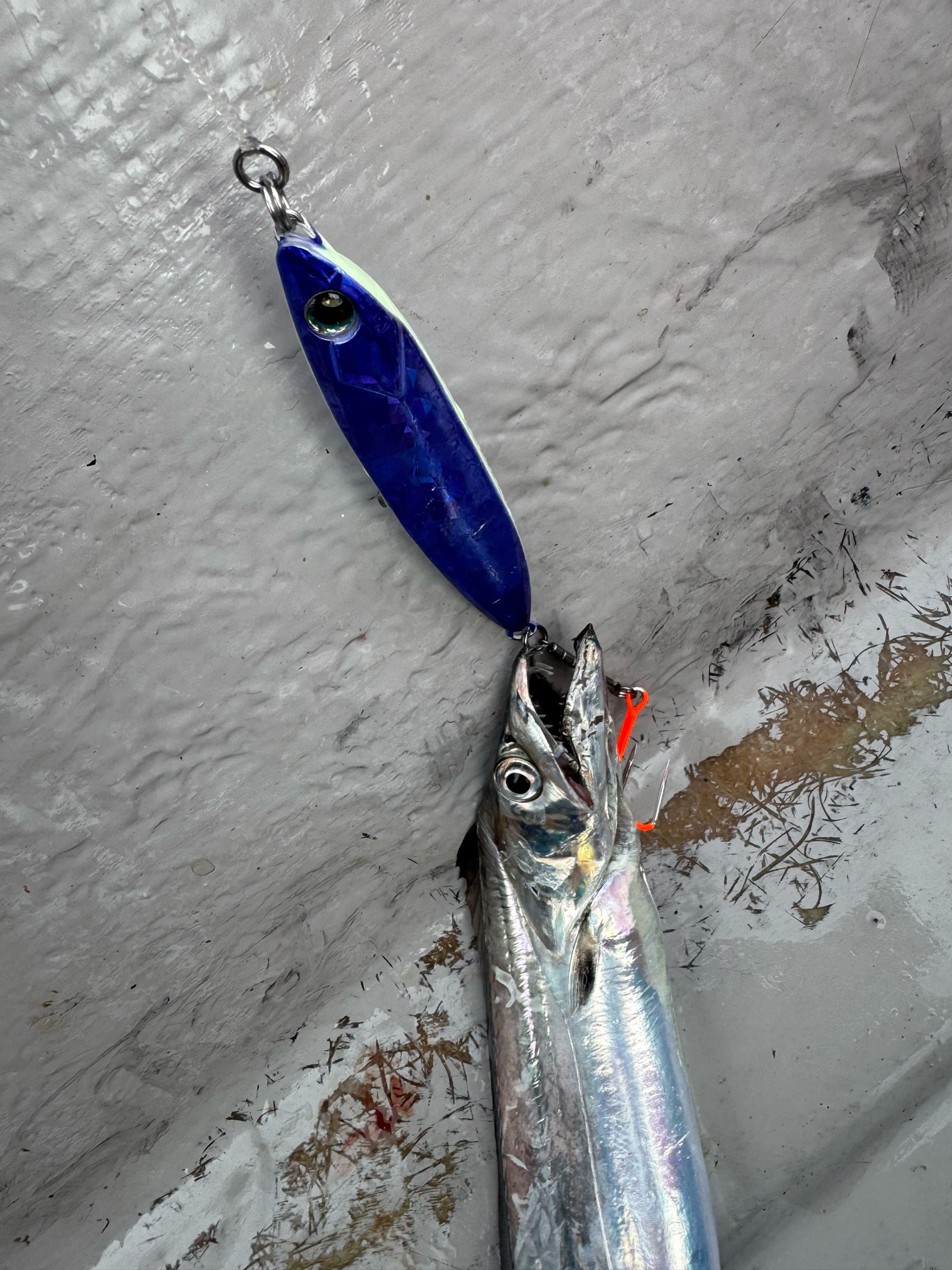 水深60〜70メートルからスタート!ダイワ鏡牙ジグベーシックにクレイジーオーシャンレブラインとトリプルフックとセットしてラインブレイク対策をすると一度もジグをなくす事なくタチウオを釣ることが出来ました!