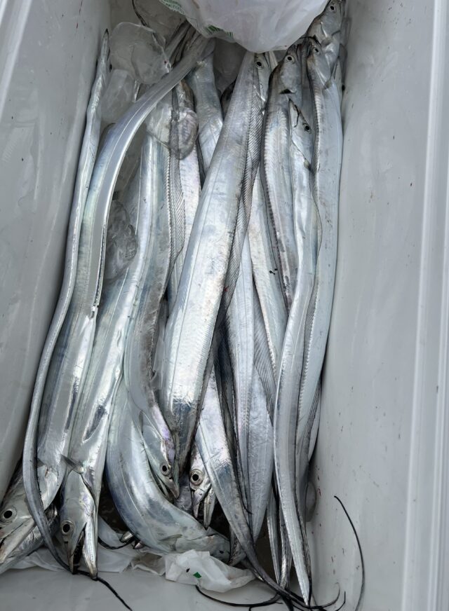 この日はいつもお世話になっている元栄丸さんでタチウオと真鯛のリレー便に行ってきました。天秤仕掛けにサンマをつけてタチウオ釣りを開始、ゆっくりと巻いているとすぐにヒットしました!つったばかりのタチウオはとても綺麗!その調子でどんどん釣り進め3時間半で19本釣りました。一緒に行った初心者も10本近く釣れていましたよ!その後はうたせ真鯛にシフトチェンジして小さいチャリコやカサゴと遊んでもらいました。元栄丸さんでは釣りによって餌や仕掛けを支給してくれる場合もあるので初心者でも手ぶらで安心!竿の貸出も1000円でしてくれ、貸切船なので知り合いといえば気楽に釣りができます!初めての船釣りならぜひ元栄丸さんにいってみてください!